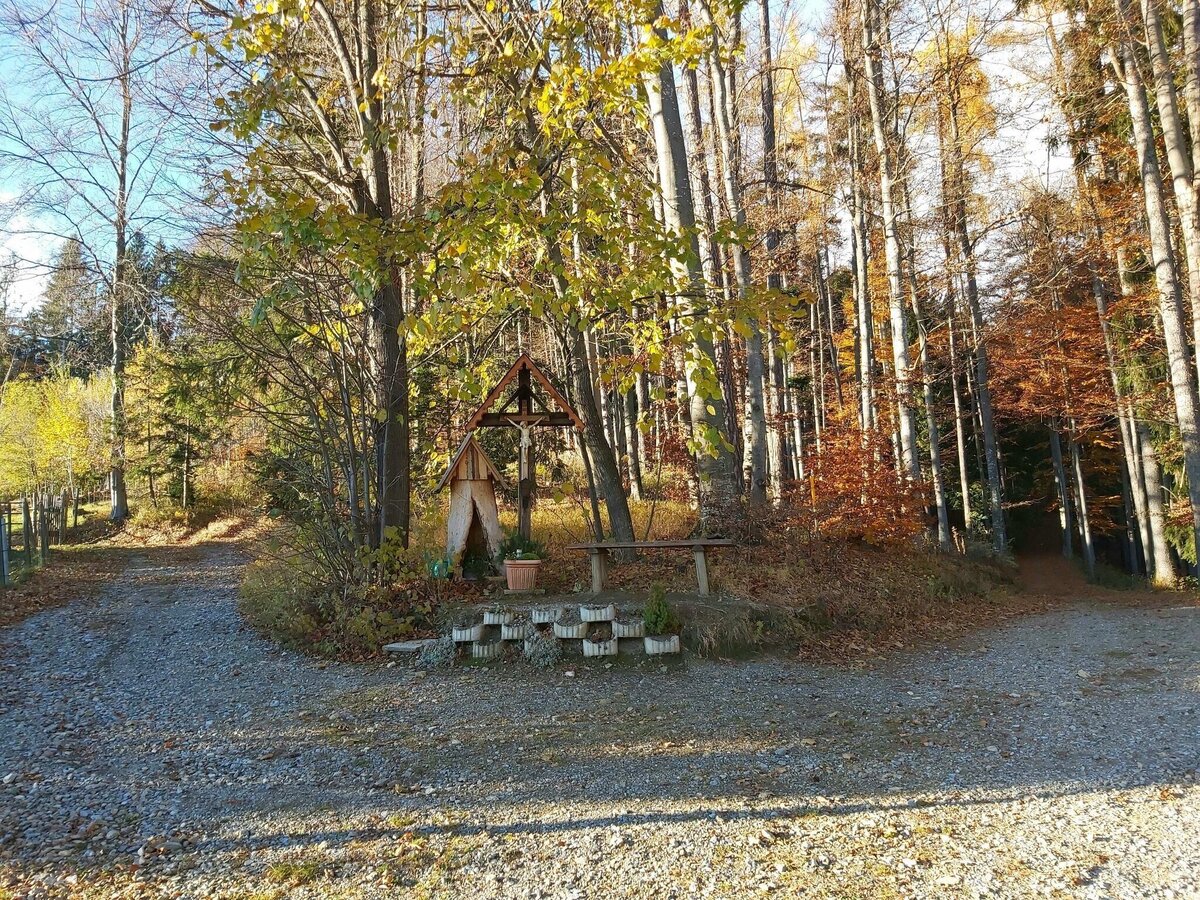 • Den Zaun entlang geht es links weiter, hinunter bis zur Weggabelung beim Hochwarter-Kreuz.