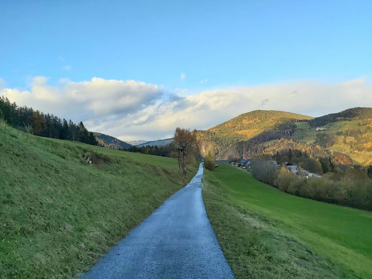 • Wir erreichen jetzt die Straße und gehen auf dieser links hinauf weiter bis in den Ort „Gschaid“.