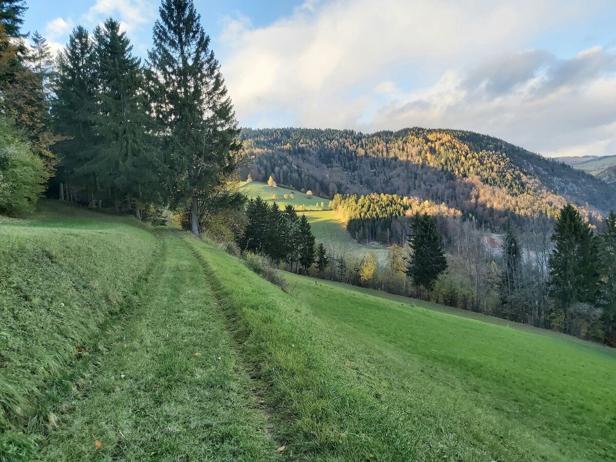 • Gleich beim Hof biegen wir scharf links hinaus ab und gehen jetzt am Wiesenweg weiter. Rechts sehen wir jetzt den Wolfsattel mit dem Steinbruch.