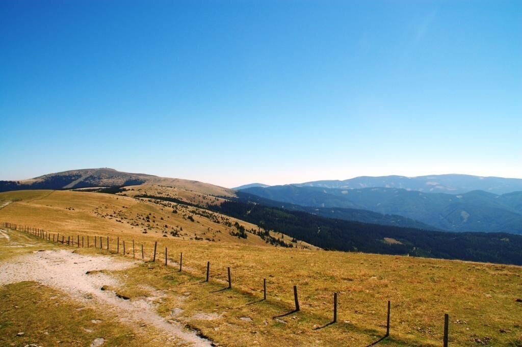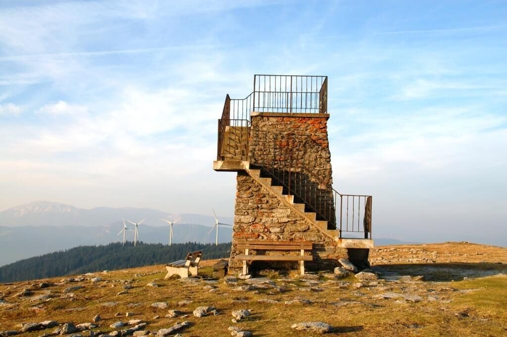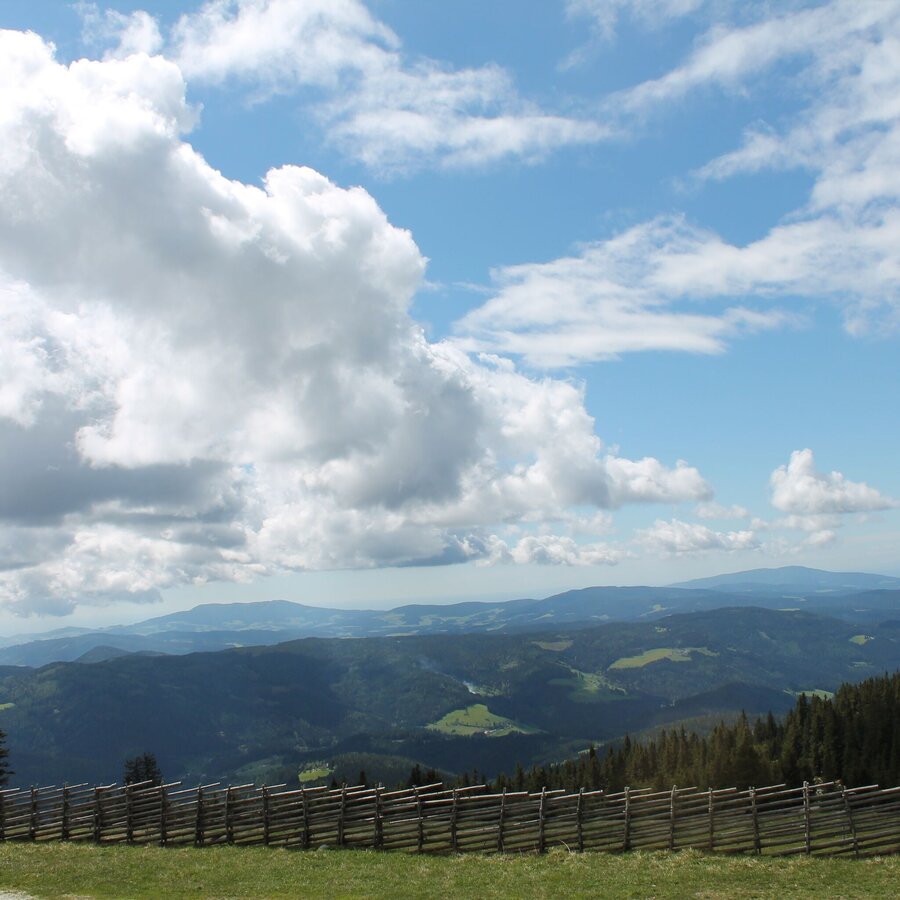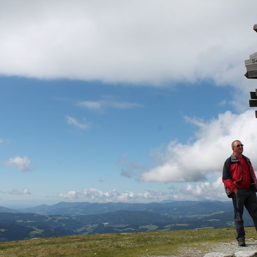 Schöner Höhenweg in den höchsten Gipfeln der Region Joglland - Waldheimat: Vom Roseggerhaus auf der Pretul wandert man immer entlang des Zentralalpenweges 02 auf den nächsten Gipfel, das Stuhleck. Auf der Pretul steht mit der Peter Bergner-Warte ein besonderer Aussichtspunkt. Die Warte wurde zu Gedenken eines ehemaligen verstorbenen Hüttenwirtes erbaut.