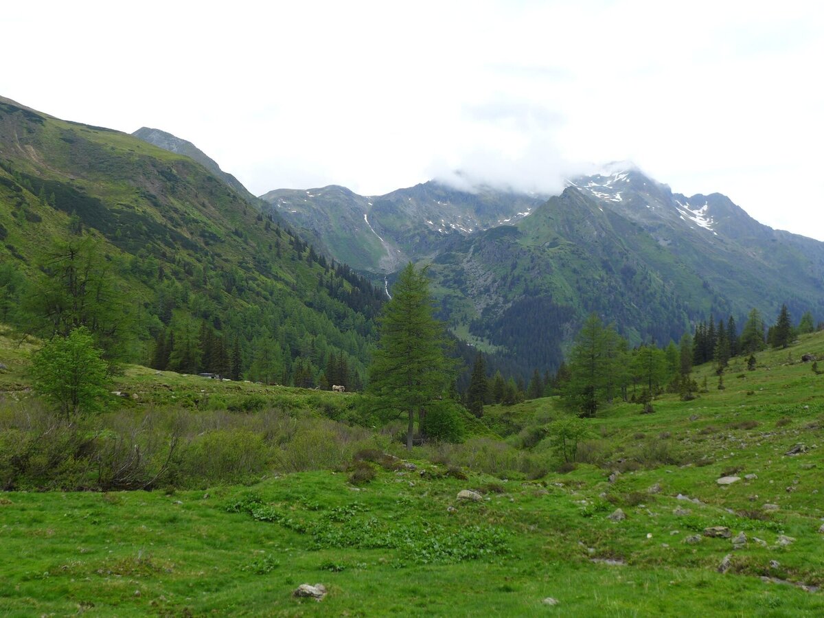 Nach der Winkleralm geht der Weg immer steigend durch den Wald. Kurz vor der Mahdfeldalm lichtet sich der Wald, ehe man bei der Mahdfeldalm den freien Blick zum Deneck und ins Großsölktal genießen kann. Von der Mahdfeldalm folgt man dem Almweg (Weg 926 / Weitwanderweg 909) Richtung Südosten bis zu folgender Weggabelung (2.000m): Dem bisherigen Wegverlauf folgend führt der direkte Weg über die Haseneckscharte (2.205m) und dann absteigend in Richtung Neunkirchner Hütte (1.535m) / Eselsberger Almhütten.
