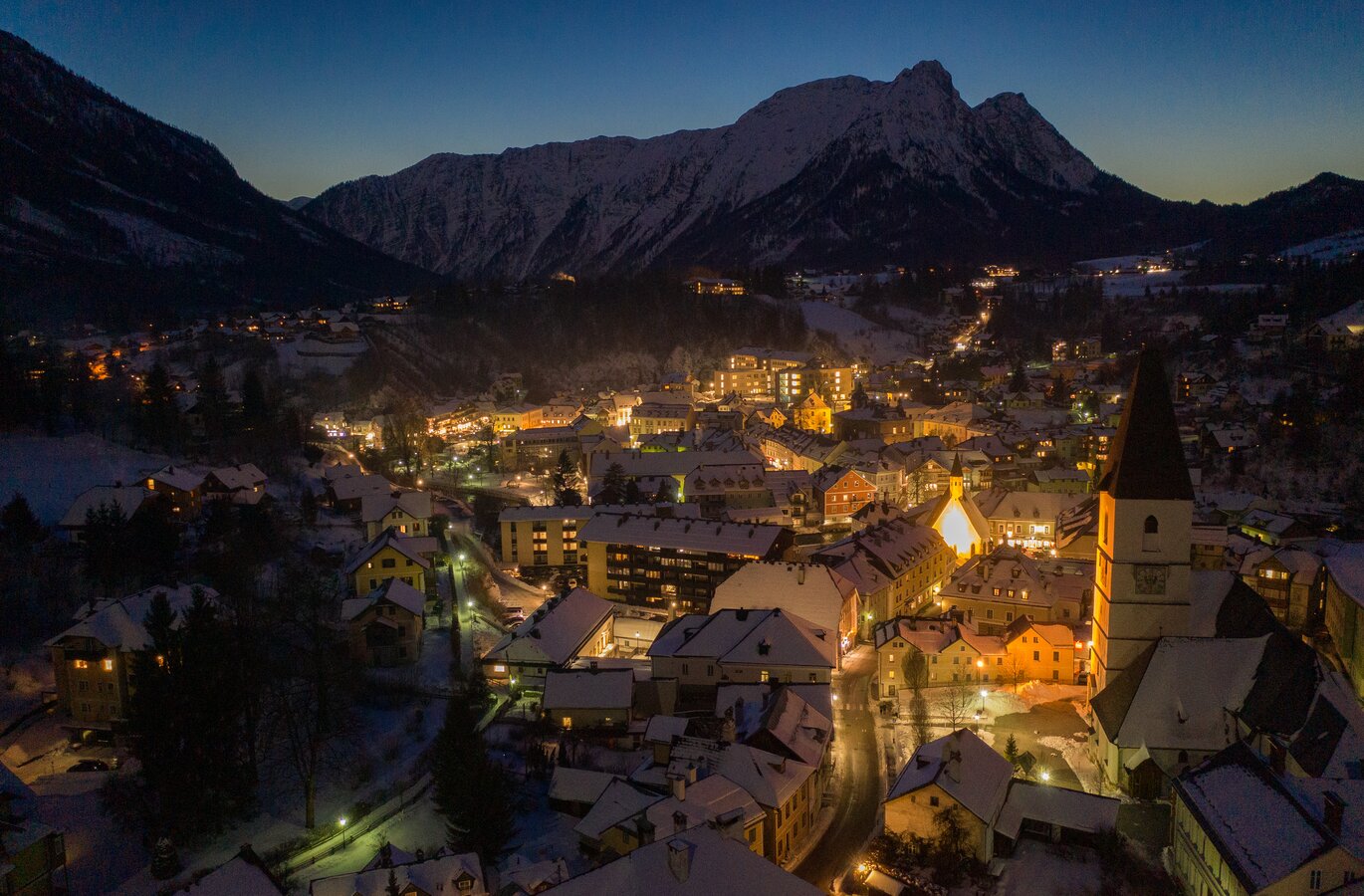 In autumn, Bad Aussee attracts visitors with colorful forests, sunny hiking days, and an especially clear light that bathes the mountains in a warm golden glow. The shopping streets in the town center invite for leisurely strolls and indulgence, while cozy cafés and inns serve regional specialties. In winter, Bad Aussee reveals its romantic side. Winter walks, snowshoe hikes, and cross-country skiing in the surrounding snowy landscape delight nature lovers. The proximity to the Loser and Tauplitzalm ski areas makes Bad Aussee an ideal base for a winter holiday in the Ausseerland.