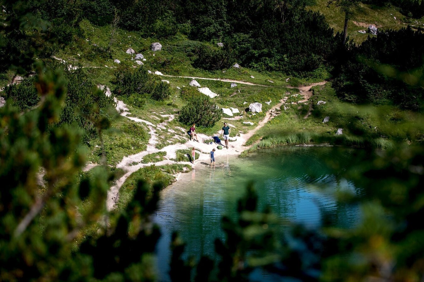 The trail continues in a westerly direction to the Großsee, where people like to take a break - not least to watch the ducks. Shortly afterwards, you reach the Märchensee, an emerald-green gem in the middle of the alpine pasture. Just behind it, the route reaches Öderntörl, a broad rocky saddle between Schneiderkogel and Traweng.