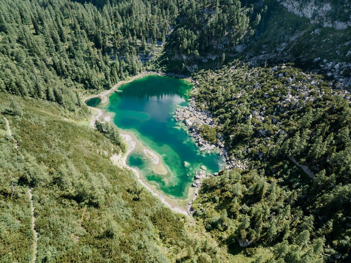 The marked path continues eastwards over a steep slope above the lake. Hidden below is the Hintere Lahngangsee, which is surrounded by dense forests.