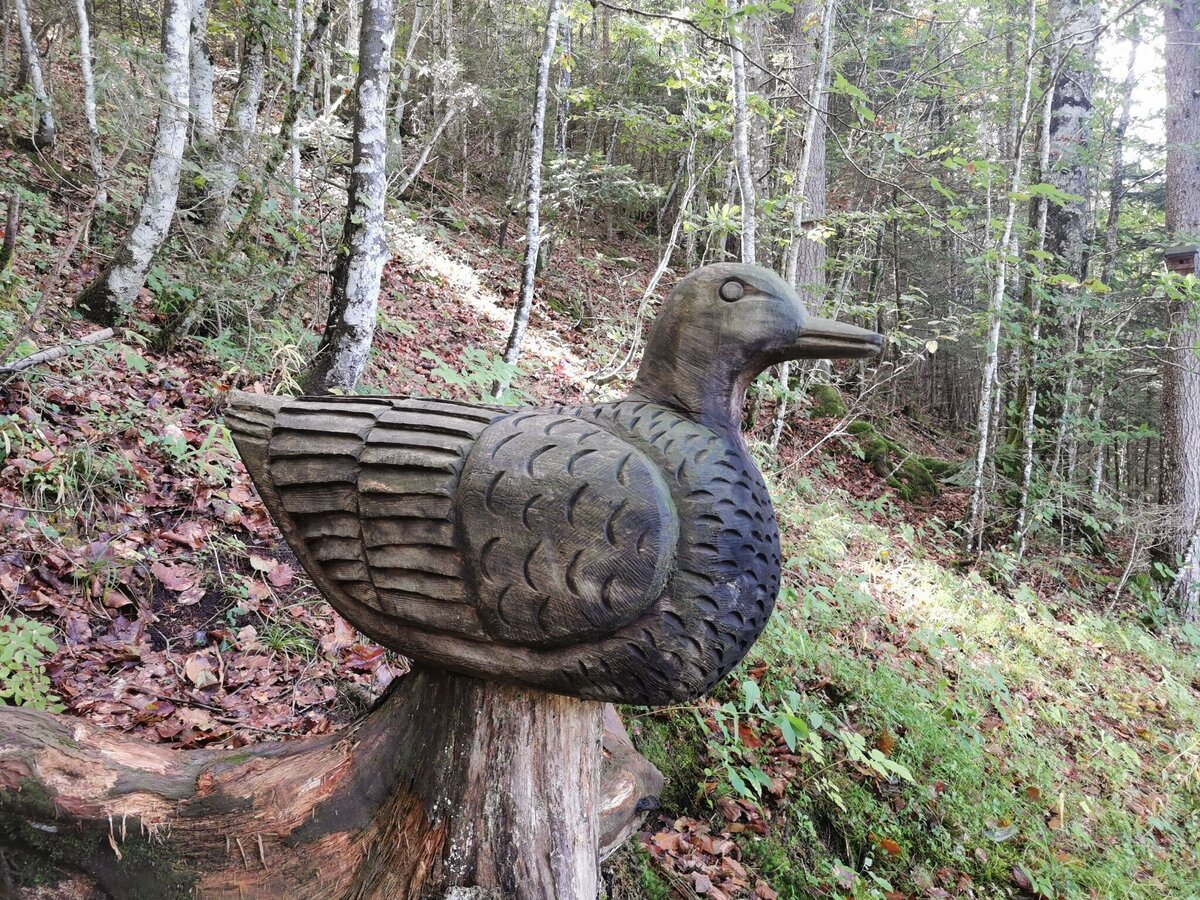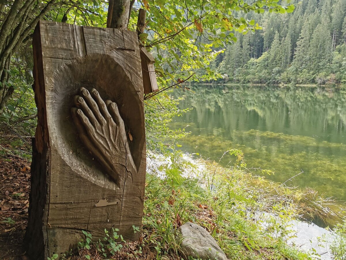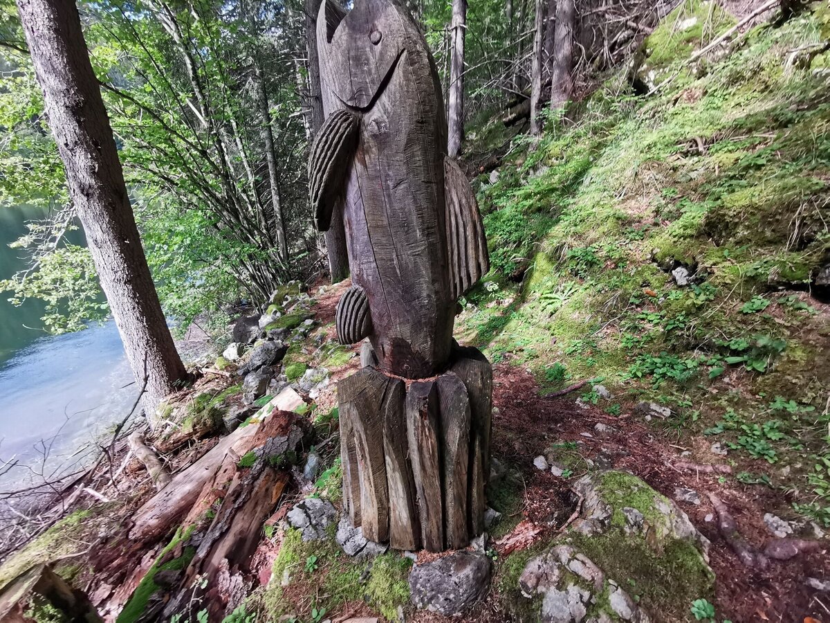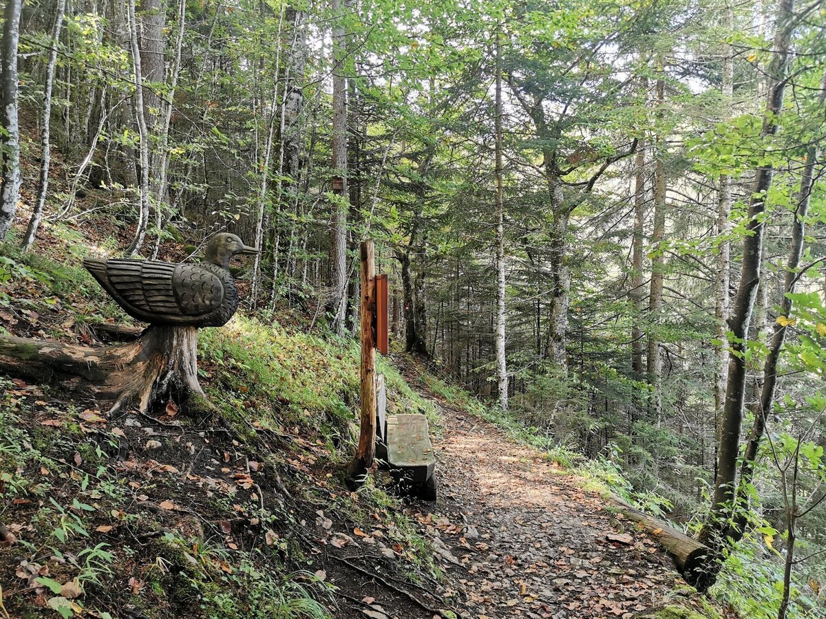 The forest trail near the Salza reservoir is a short hiking trail that leads along some wooden figures through an idyllic forest.