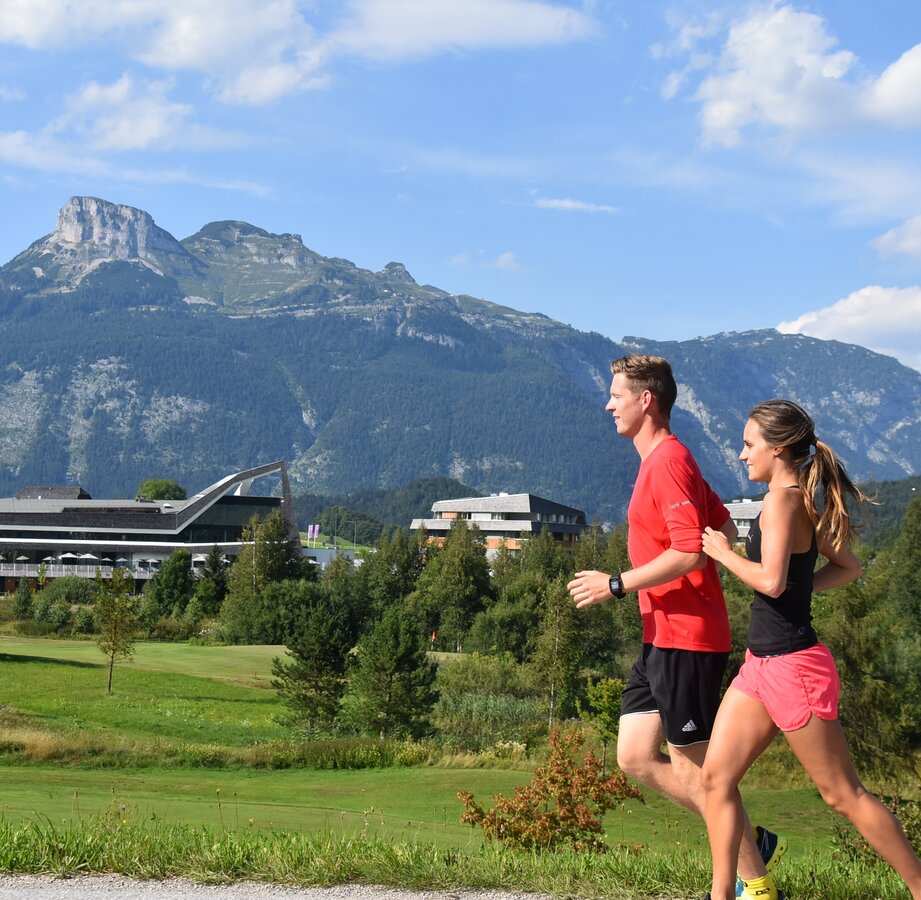 After a short descent, the route turns right at km 2.7 towards Fischgasse. With a view of the golf course and the resort, turn right at km 3.8 onto Graumoosweg, right again at km 4.0 and left at km 4.1 back to the starting point.