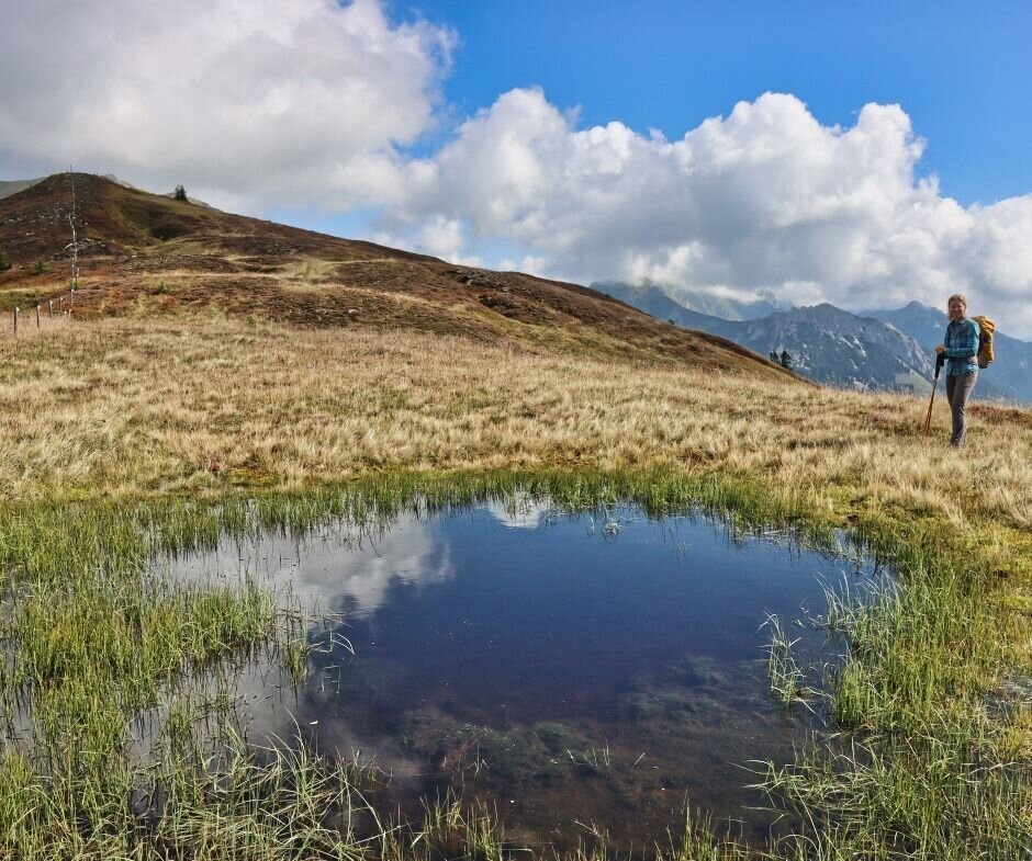 From here we continue to Wildfeld, the first part of the trail is still in the forest, but after the tree line you already have the first great views of the surrounding mountains. Arrived at the Teicheneggsattel, trail No. 673 leads over partly steep alpine meadows and scree paths to the Wildfeld.