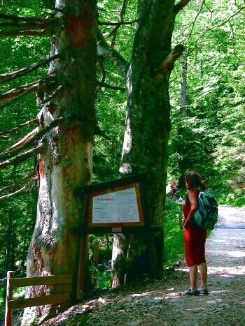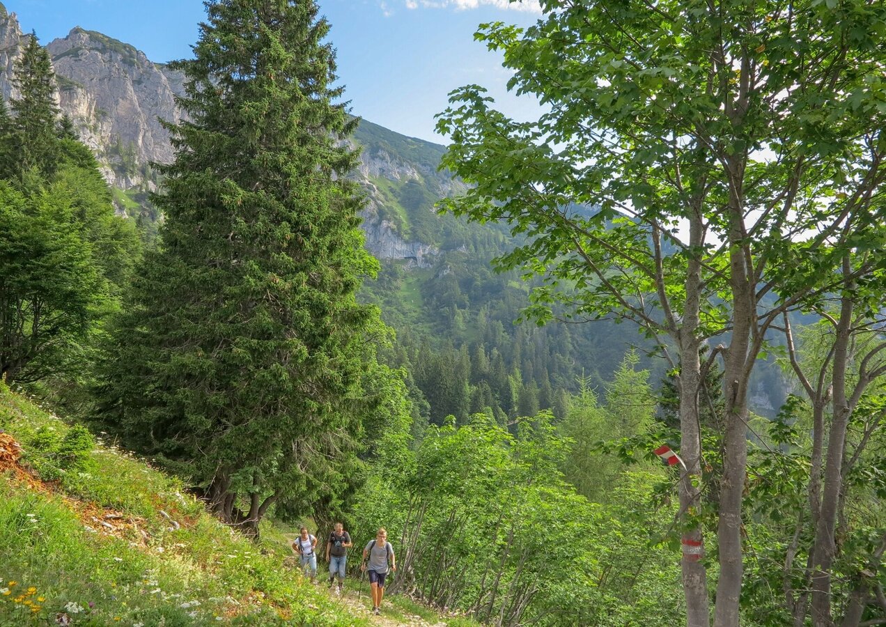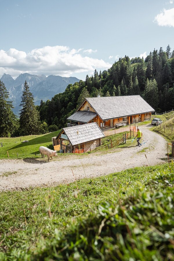 We begin our leisurely family hike at the Buchauer Saddle and follow the signs toward the Grabneralm. The trail partly leads us through a hollow path, then along a forest trail, and finally reaches a forest road. When we arrive at the boundary of the Agricultural College Grabnerhof, we come across information boards on the topic of alpine pastures. Through a series of engaging displays, we learn more about alpine farming—then and now. After about one and a half hours of hiking, we reach the Grabneralm House. This alpine pasture also has a long tradition: Dr. Paul Schuppli, an energetic Swiss and director of the agricultural college Grabnerhof in Weng, had the Grabneralm built between 1915 and 1925 as a “School for Alpine Farming.”