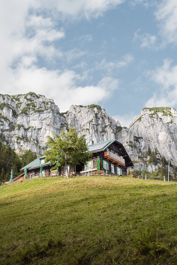 Now it’s time for a well-earned break—after all, we’ve more than deserved a good snack and something to drink. A cozy parlor or a large terrace invite us to relax. But we haven’t yet reached our final destination. The trail continues in several winding turns to the right of the Grabneralm, leading toward the summit of the Grabnerstein. With a bit of luck, we might arrive just in time to see the mountain daffodils in bloom. In any case, we can enjoy the colorful cushions of alpine flowers lining the path on both sides. The Grabnerstein is rightly considered the most beautiful “flower mountain” in Styria, and botanists never tire of praising its rich variety of alpine flora. Time passes quickly until we reach a curious stone ruin just below the summit. Around 100 years ago, this was an experimental stable belonging to the “School for Alpine Farming” and is also part of the alpine education trail. From here, it’s only a short distance to the summit of the Grabnerstein, where we can enjoy magnificent views of the Gesäuse mountains.