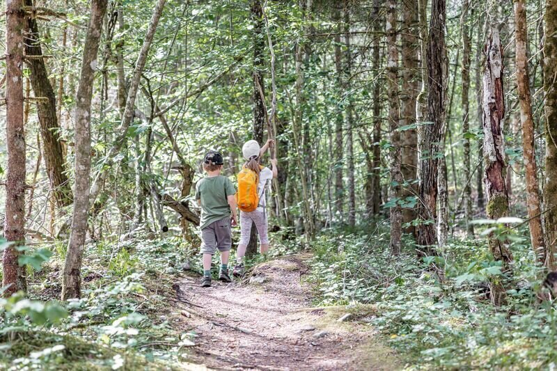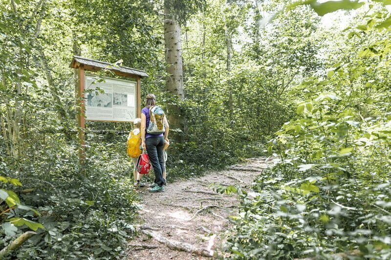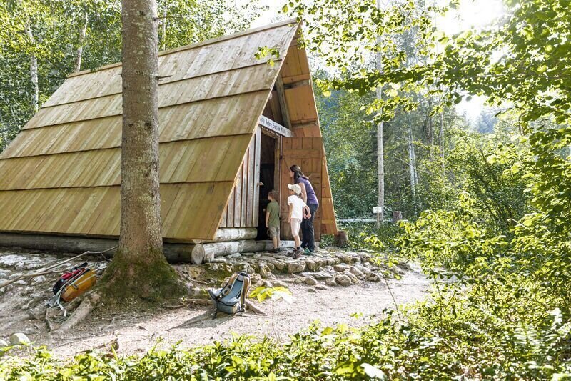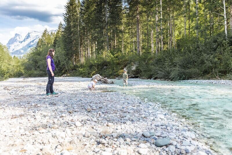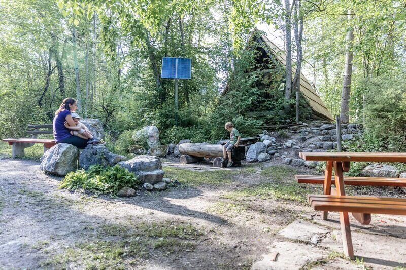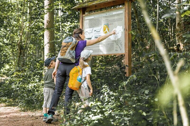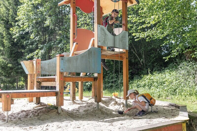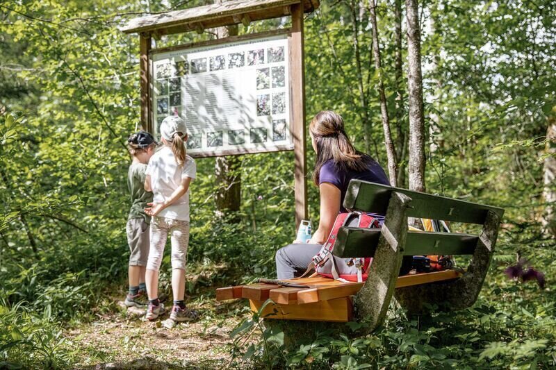 We start the leisurely family hike at the amusement park in Hall, the children can already let off steam at the various playground equipment before we start on the Waldsteig along the Eßling. Theme boards tell about the history of Hall, which has always been connected with salt production. Fauna and flora along the way are also included on the information boards. Where a meadow borders the path on the right, we make a short detour and climb the steps to a small wooden viewing platform. The semicircular arena of the Haller Walls with Scheiblingstein, Kreuzmauer, Hochturm, Kesselkargrat, Hexenturm, Naterriegel and Mittagskogel is in front of us and we enjoy the breathtaking view into the rocky scenery. Then we disappear again into the forest and soon reach a small grading facility. We open the door and press the switch on the left side. Already the salt water starts trickling over the fir brushwood, we sit down on the bench and breathe deeply in and out. This is balm for our lungs and many a cold can be cured here. Then we enjoy the sun on the benches at the place in front of the grading plant, always the food within reach, so that the children can play at the brook before we leave again. The path soon leads to a meadow and finally we come to an asphalt road. Now we keep to the right and cross the Zirnitzstraße at the sports field (refreshment point Sportplatzstüberl). Cross the valley across the open fields until you come back to the village road near the outdoor swimming pool, which takes you right back to your starting point. On the way we pass the Sulzgraben, here was one of the salt springs, the Kirchenwirt Hall (excellent cuisine), the Haus Unterpfanner, here was a brew pan, and finally the Gemeindeamt Hall.Here we can get an overview of our round trip on the local map, then we march along the village street back to the leisure park.
