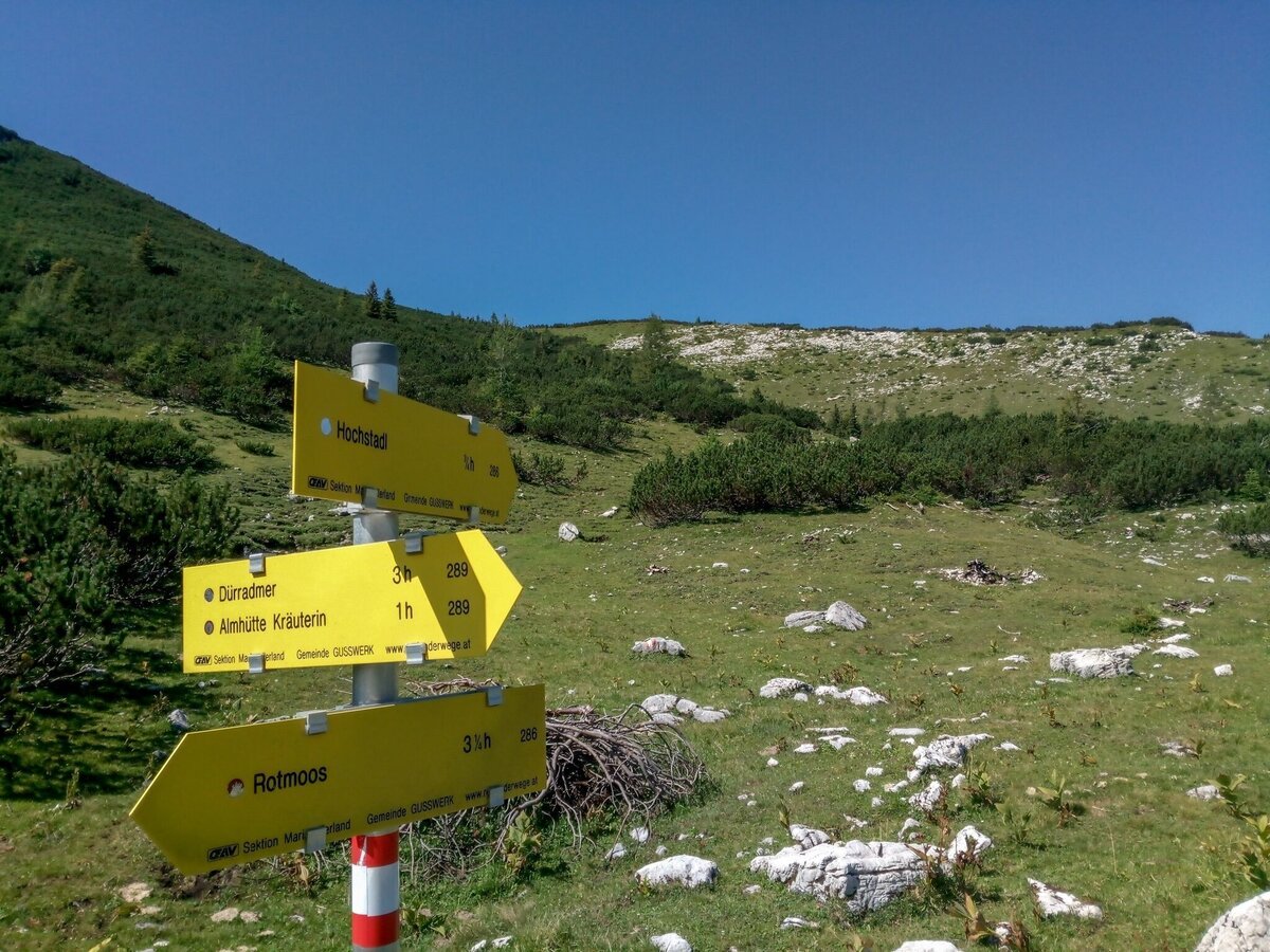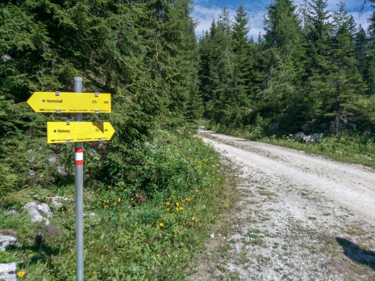 to Rotmoos. On the plain we already see the first sign. After another 3 hours of following the signs, we reach the valley to Romoos, mostly on paths but also partly on forest roads.