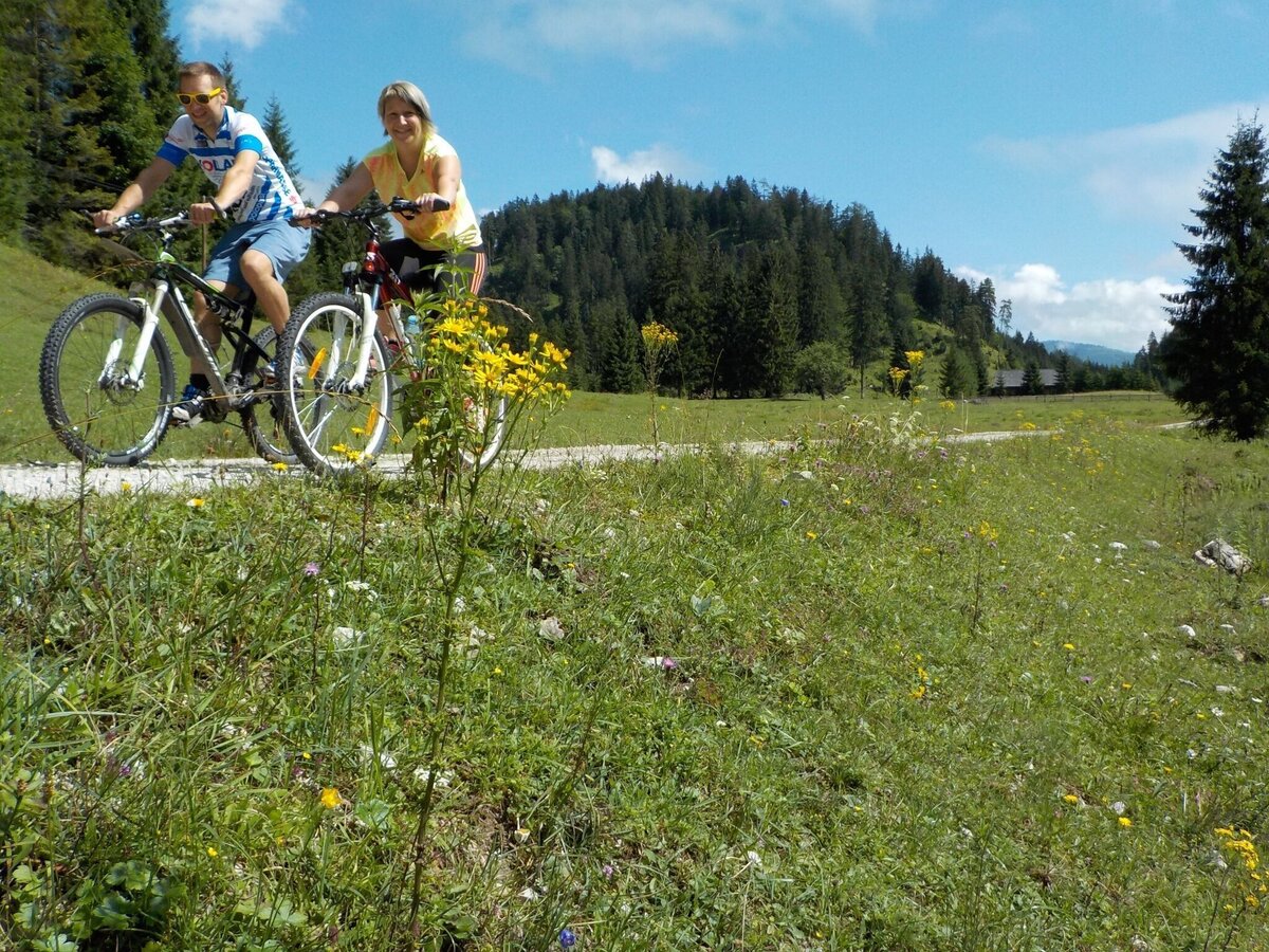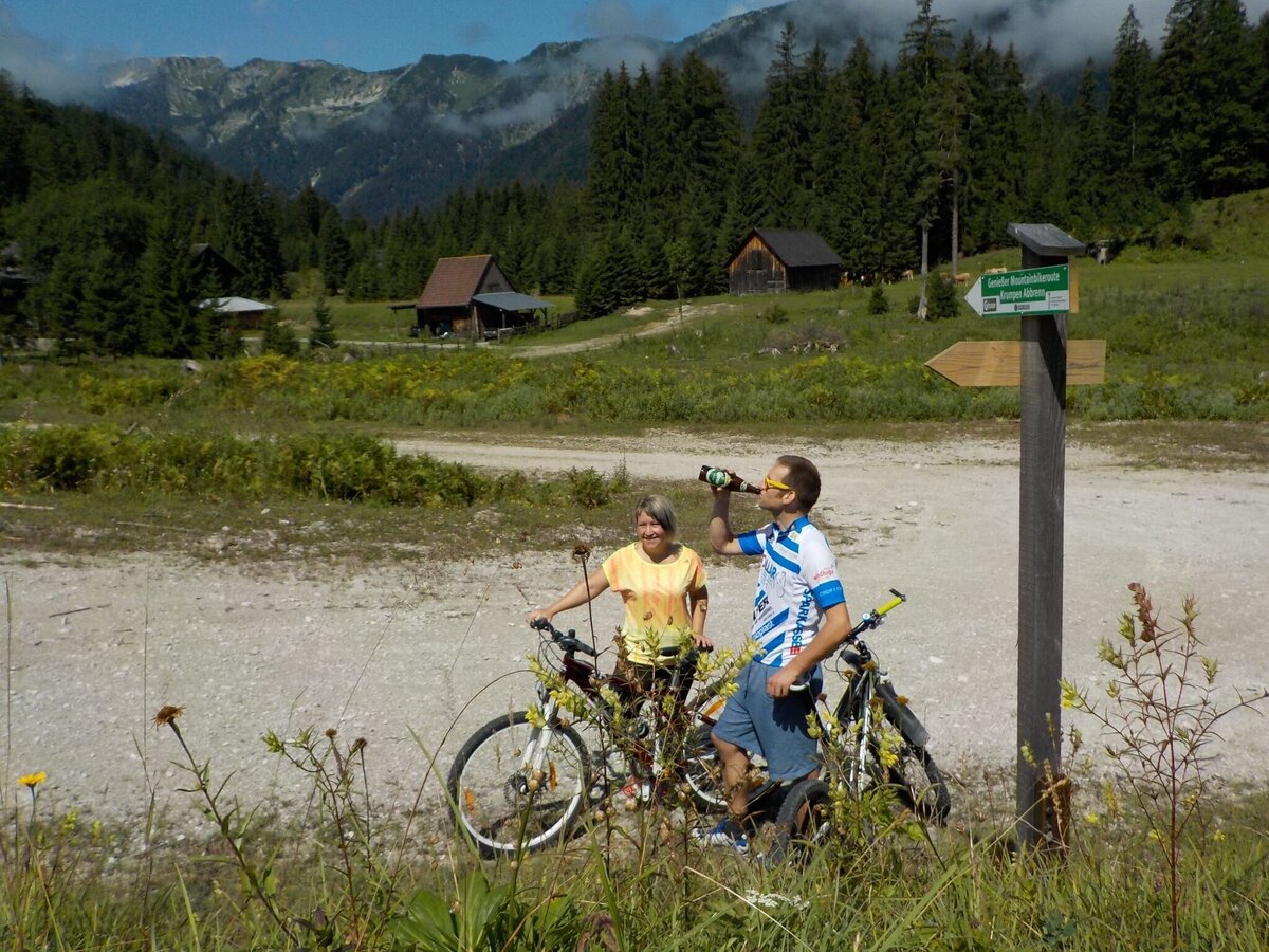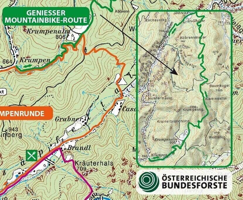 The Krumpen - Abbrenn connoisseur mountain bike route begins at the junction. A forest road (gravel) now leads up to the lovely, unspoilt, gentle Krumpenalm, then the climb steepens and you can enjoy the view of the Riegerin, Grießstein, Ebenstein on the Hochschwab mountains and also the Kräuterin in the Ybbstaler Alps.