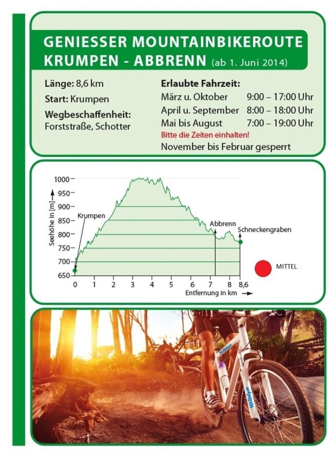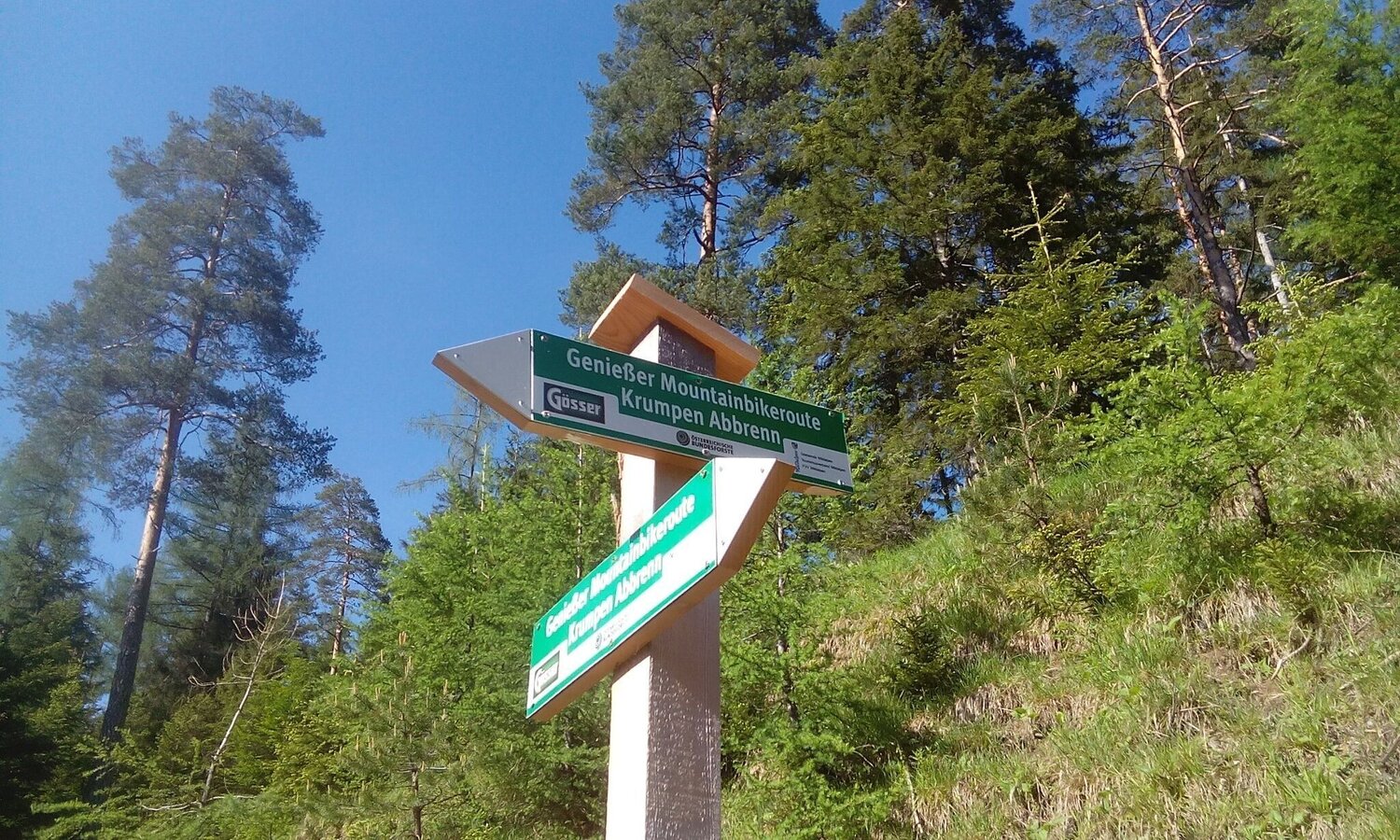 A few more bends along the forest road and you end up very remotely at the junction in the Schneckengraben and come back to the LI 3 cycle path (rather no mobile reception). However, the mountain bike route for connoisseurs Krumpen - Abbrenn does not end at the starting point.