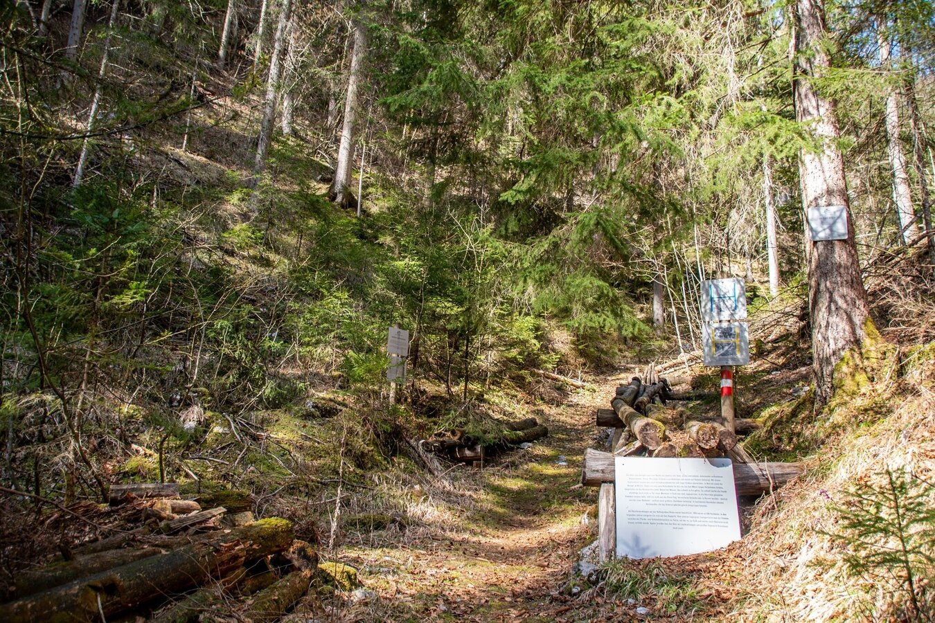At the replica of a former wooden giant, the romantic path leads moderately uphill to the end of the valley, which resembles an arena. From there, on the left-hand side of the slope, a well-developed path leads up in several serpentines about 50 m long and further along a path well secured with steel cables over this natural barrier. At a decaying replica of a lumberjack's hut and fallen giant trees, the Schwärzerweg leads slightly uphill to the Forstweg. This connects the Niederscheibenberg and the Moar-(nieder)alm.