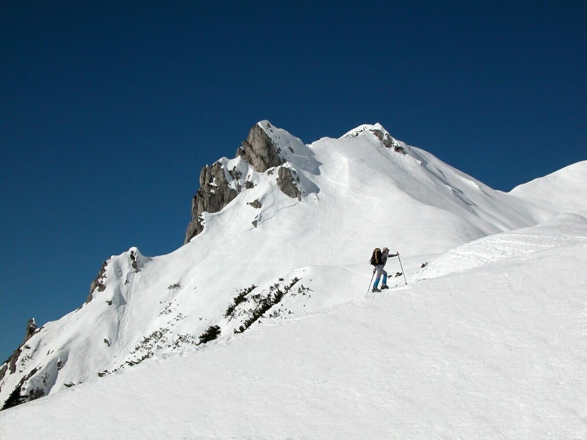 From here, we turn left and climb the ditch, which is overgrown with bushes, before making a wide arc to the north-west to reach the wide, beautiful Südkar. Below the Kreuzmauer, we turn right and climb up a ridge to the rocky summit (ski depot!). Note: Please only ascend to the summit on skis in very good conditions. It should also be noted that the steep descent from the summit is only suitable for experienced ski tourers. The descent follows the ascent route.