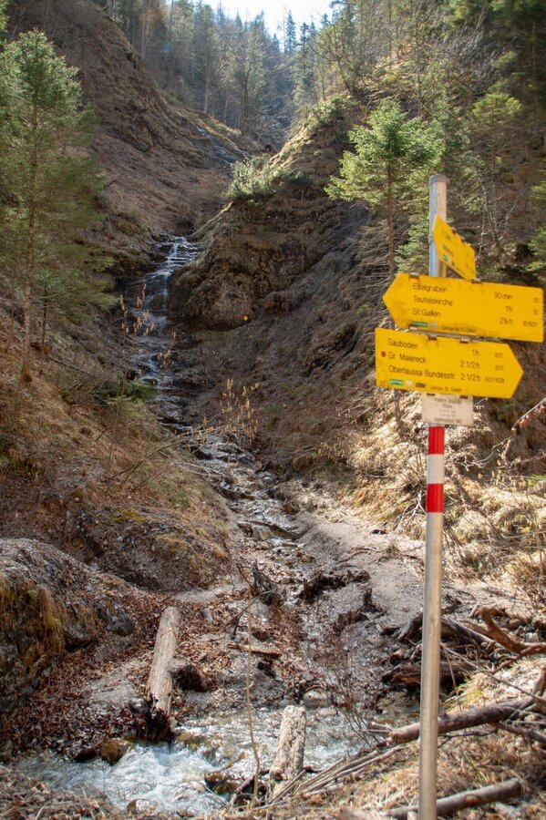 We hike along the road past the "tin can settlement" "Weg 638" and keep left. We continue to follow trail nr. 637 through the romantic Spitzenbachklamm. The Spitzenbachklamm is always wonderfully signposted. To the end where a small path begins which would bring us to the Gr. Mayreck. We walk the same route back to the starting point.