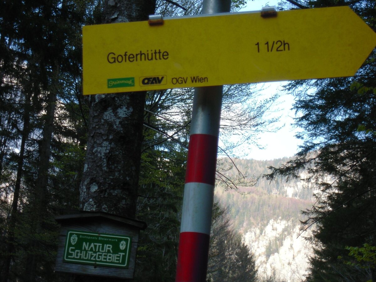 We start our hike right away with a decent climb on the forest road. But the view of the Admont Reichenstein rewards us for the effort. Soon the road disappears into a cooling mixed forest, and especially in spring we are accompanied by many different bird voices from the cuckoo to the chiffchaff and various species of woodpeckers. The flora is also particularly lush here, especially in the upper rocky parts along the path. Unforgettable in spring is a steep rock face next to the forest road, full of Petergstamm, the alpine auricula. But please only admire it and hunt it with your digicam, it is strictly protected. After numerous hairpin bends, we have covered the metres in altitude and hike along a flat stretch of path, crossing the Goferbach stream, to a small alpine meadow, the Goferalm with the Goferhütte hut. Around the hut we look for a comfortable place to have a snack. With a bit of luck we can watch a golden eagle using the thermals north of the Reichenstein to gain altitude.Finally, we make our way back, eyes wide open, to inhale the view of the Buchstein and Tamischbach Tower, then in the lower area the imposing wall of the Raspberry Stone and the Admont Reichenstein.