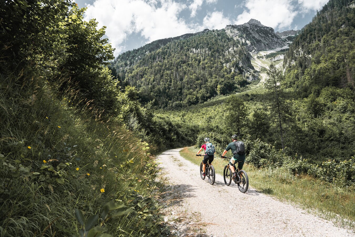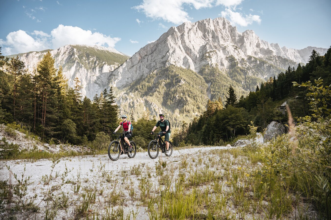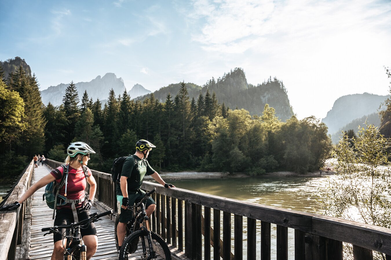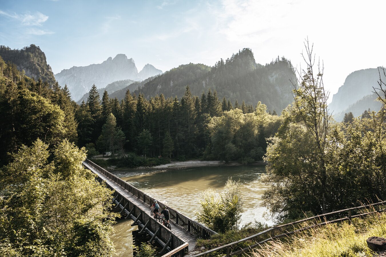 At the beginning of the village, turn right and cross the Enns over two wooden bridges. Behind them, turn left onto a small asphalt road until you reach the last houses and the start of the "Hochscheibentour" MTB trail. The road turns into a meadow path, which you follow above the Enns - in some cases taking short hairpin bends - until you reach a gravel road. Turn right into the gravel road and follow it for 650 m to the highest point at the so-called Kühboden. Now continue at a constant altitude along the forest road to the (unmanaged) Hochscheibenalm, whose idyllic location and great view of the Gesäuse mountains invite you to take a break.