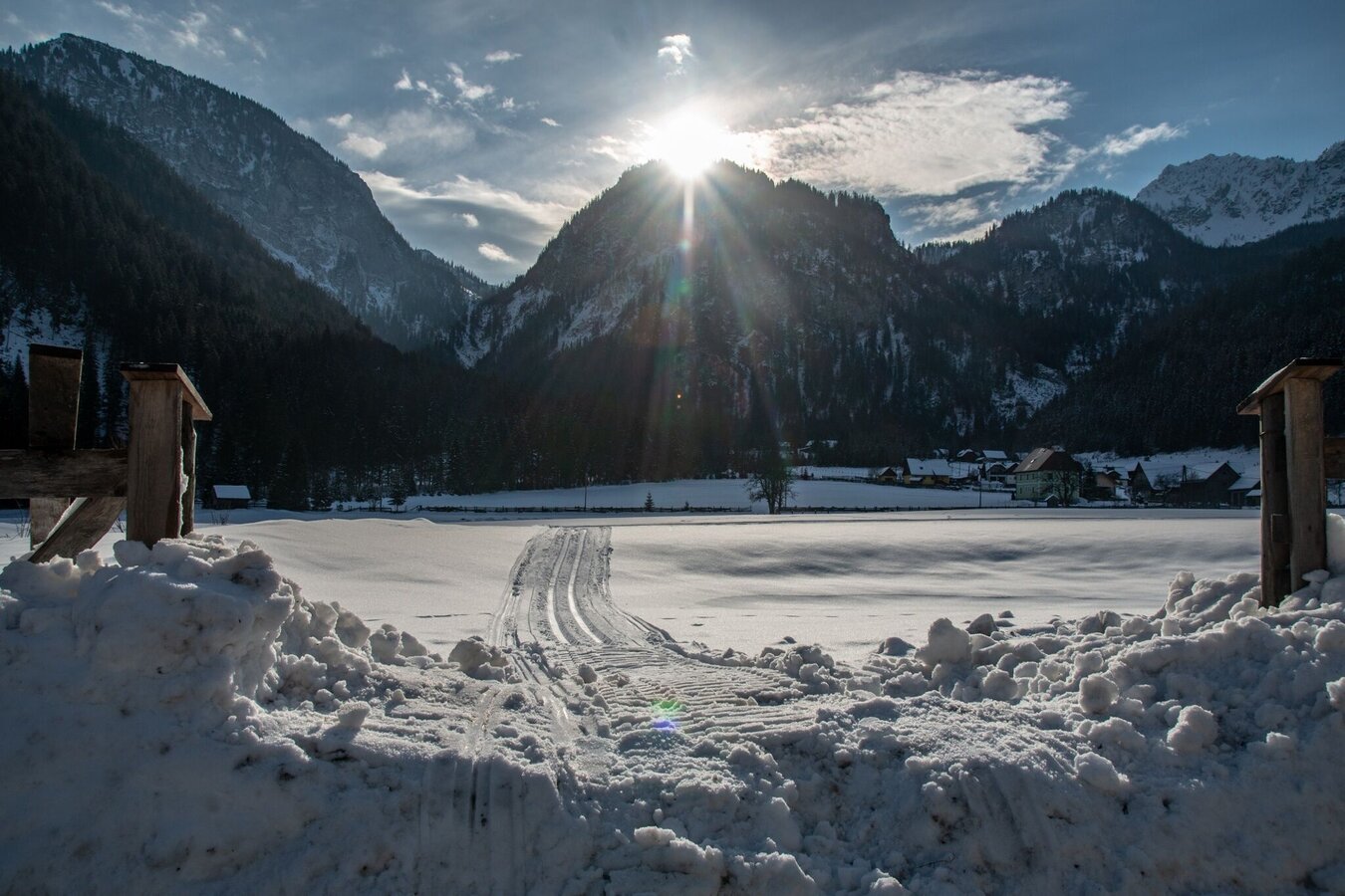 When snow conditions are good, the panoramic trail leads along narrower paths with some elevation gain in classic and skating styles on the sunny side, past small huts and repeatedly connecting to the valley floor.