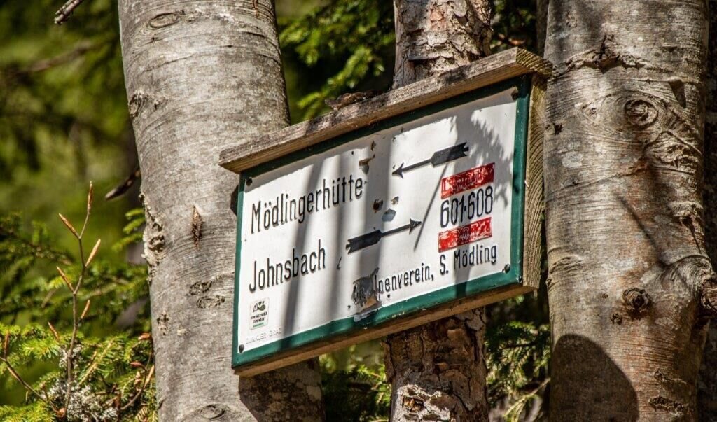 At the GH Donnerwirt in Johnsbach we start the tour on a trail, we cross the stream and soon meet the Rotleitenweg. Further up at 1.000 m above sea level we meet the former Huberalm. We should definitely take advantage of the panoramic bench, it offers a wonderful view of the Johnsbach valley and reminds us that we should have a drink before we start our sweaty ascent. Soon we meet a forest road that takes us to the Mödlinger Hütte.