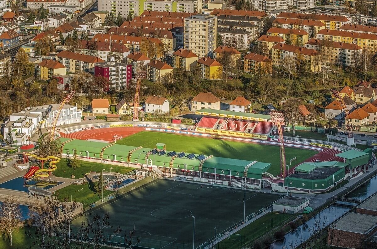 Wir fahren Richtung Zentrum und biegen bei der 3. Ampel (Kreuzung Franz-Fekete Stadion) links ab. Danach fahren wir über die Brücke und sind beim Sportzentrum Kapfenberg angelangt.