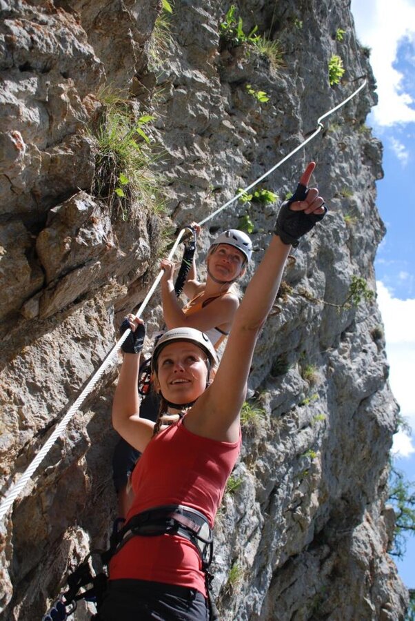 In the first half, the difficulty level ranges from A to C. Two exits also offer beginners the opportunity to get to know the via ferrata. After about half of the via ferrata, you reach the so-called "Arena", a 25 m high wall formation, in the middle of which there is an overhang of about 12 m in length. The normal via ferrata route bypasses this overhang and reaches a maximum of difficulty level D on the Austrian via ferrata scale. The "Arena Variant", on the other hand, leads directly over the large overhang and is currently considered the most difficult climbing passage in Europe, if not worldwide.