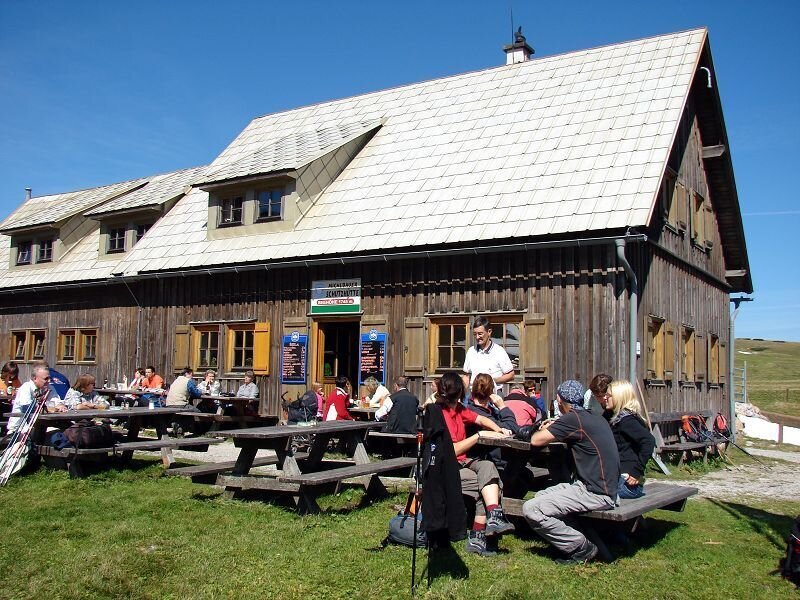 The trail continues almost level below the Rax cliffs (Raxenmäuer, climbing area) to the unserviced Reißthaler Hut (private) and then to the Waxriegelhaus (overnight stay available, www.facebook.com/waxriegelhaus.at, excellent wine list). This hut can also be reached by a simple hike from Preiner Gscheid.