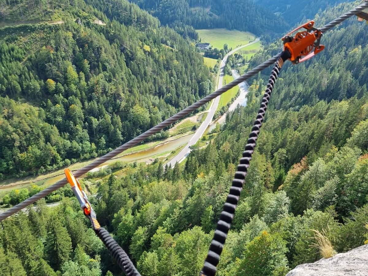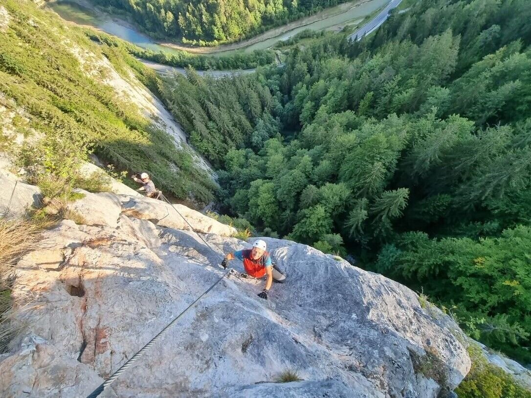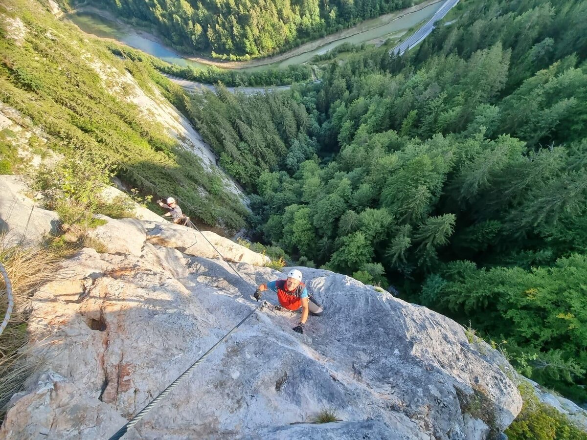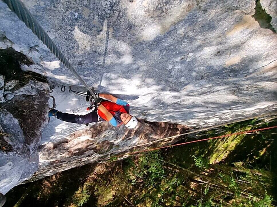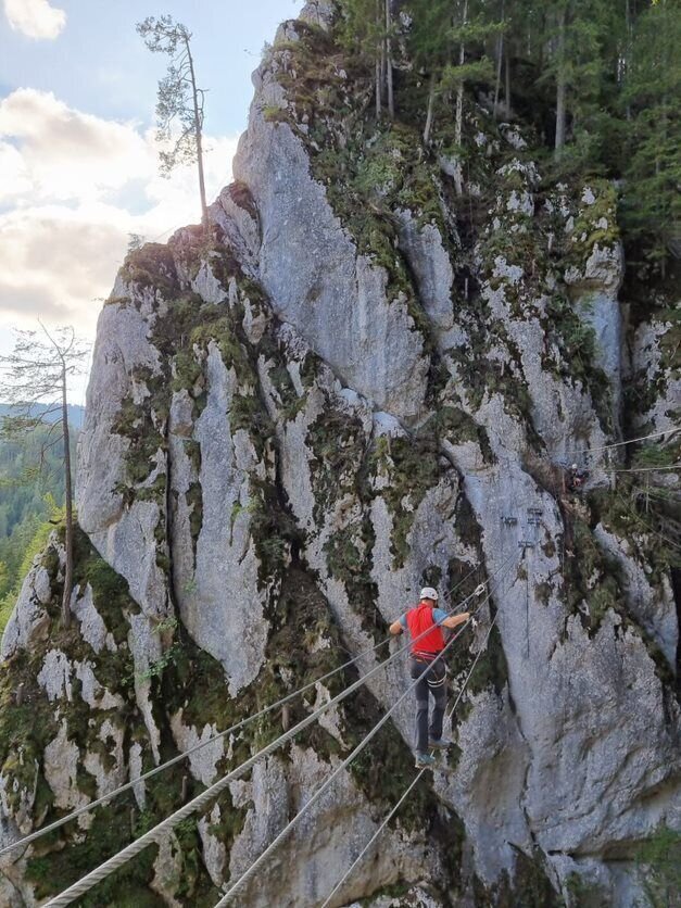 The climbing variant over Helis' incredible pillar, which was named in memory of the Neuberg mountain rescuer legend Heli Mück, has a few extremely difficult individual sections in the lower area (difficulty D and E!). This path is therefore reserved for via ferrata connoisseurs and, after about 150 meters of climbing, joins the main route mentioned above.