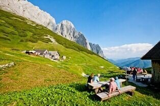 Meadow paths now lead to the Fölzsattel, where the Ochsensteig trail on the left takes us towards the Voisthalerhütte. We reach this refuge after a further hour's walk. It's worth stopping for a bite to eat here again.