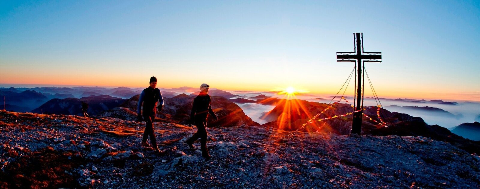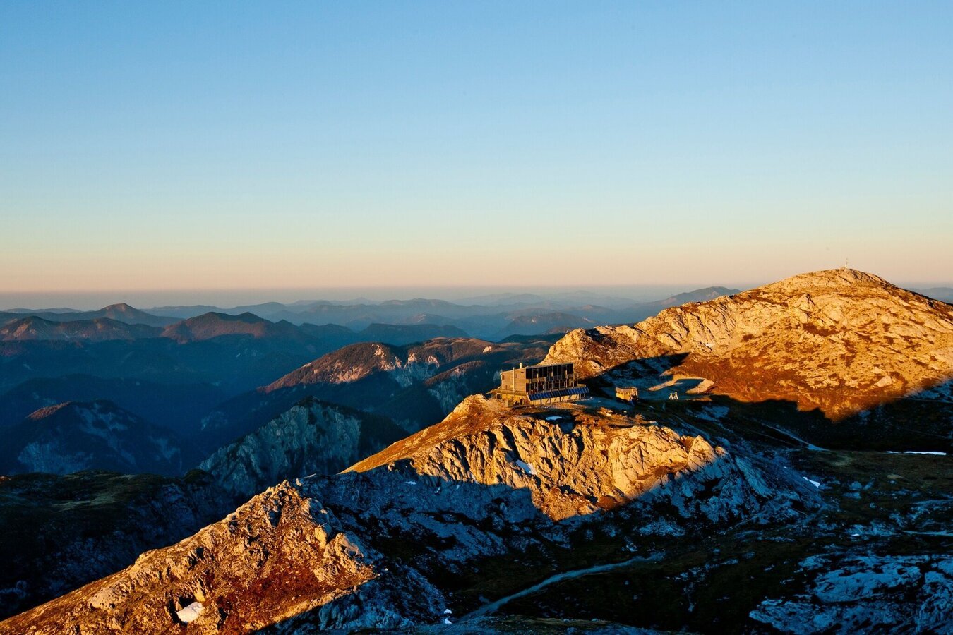 From the Voisthalerhütte, we now take the Graf Meran Steig to the Schiestlhaus. Here it gets rockier and we have to make a lot of metres in altitude. Gradually, we continue up towards the high plateau and then we can already see the summit. After around four and a half hours of walking, we reach the Schiestlhaus, from where it is another 20 minutes' walk to the Hochschwab summit cross. A sunset we will remember forever.