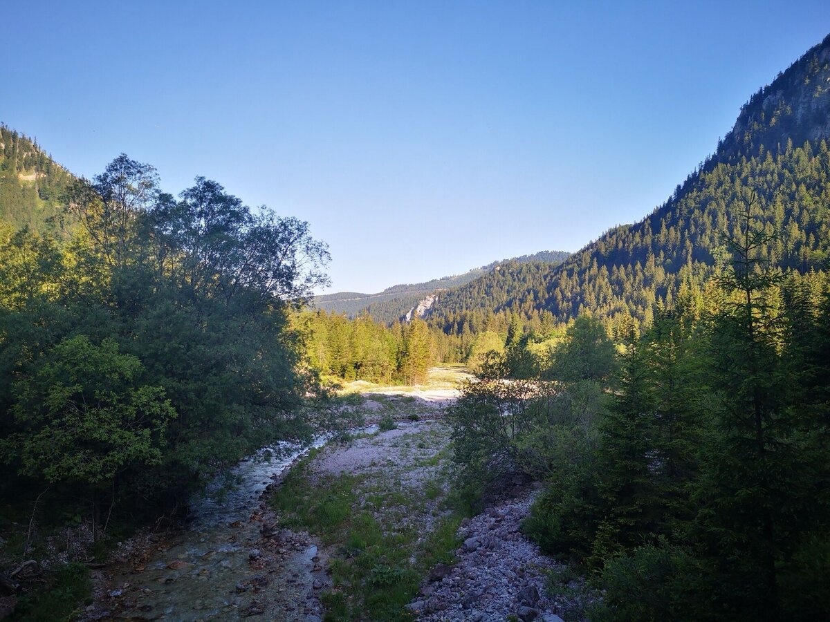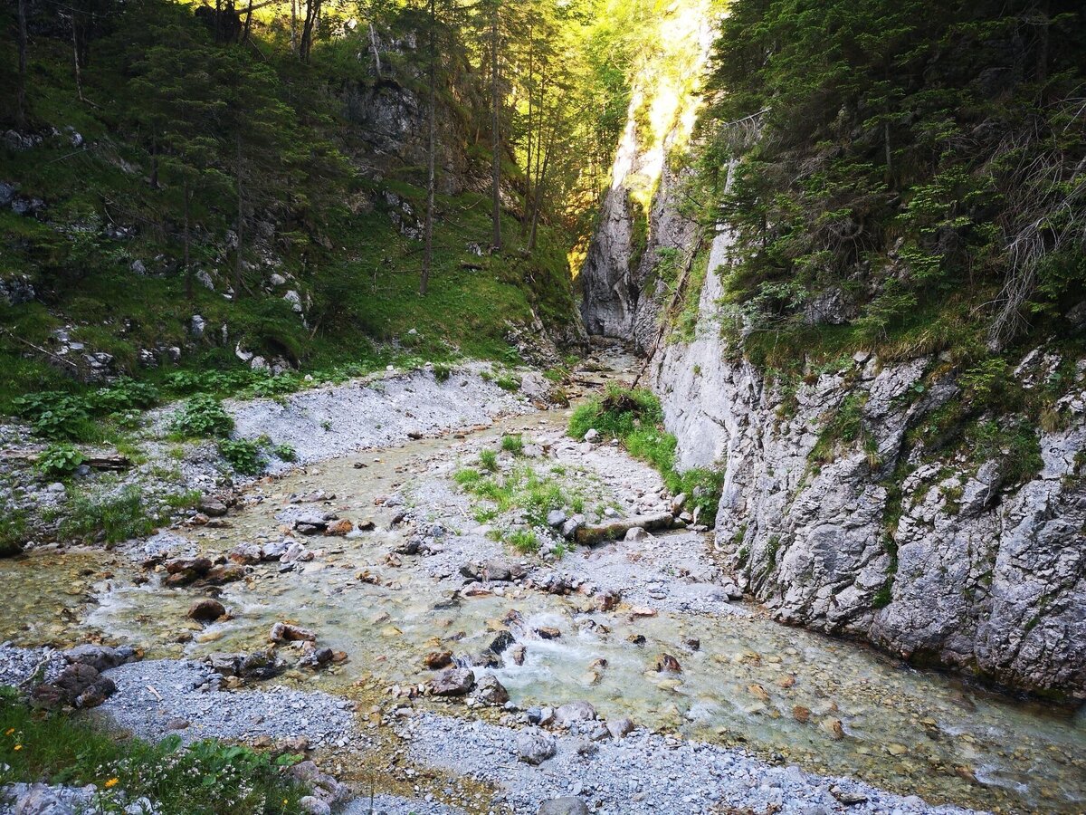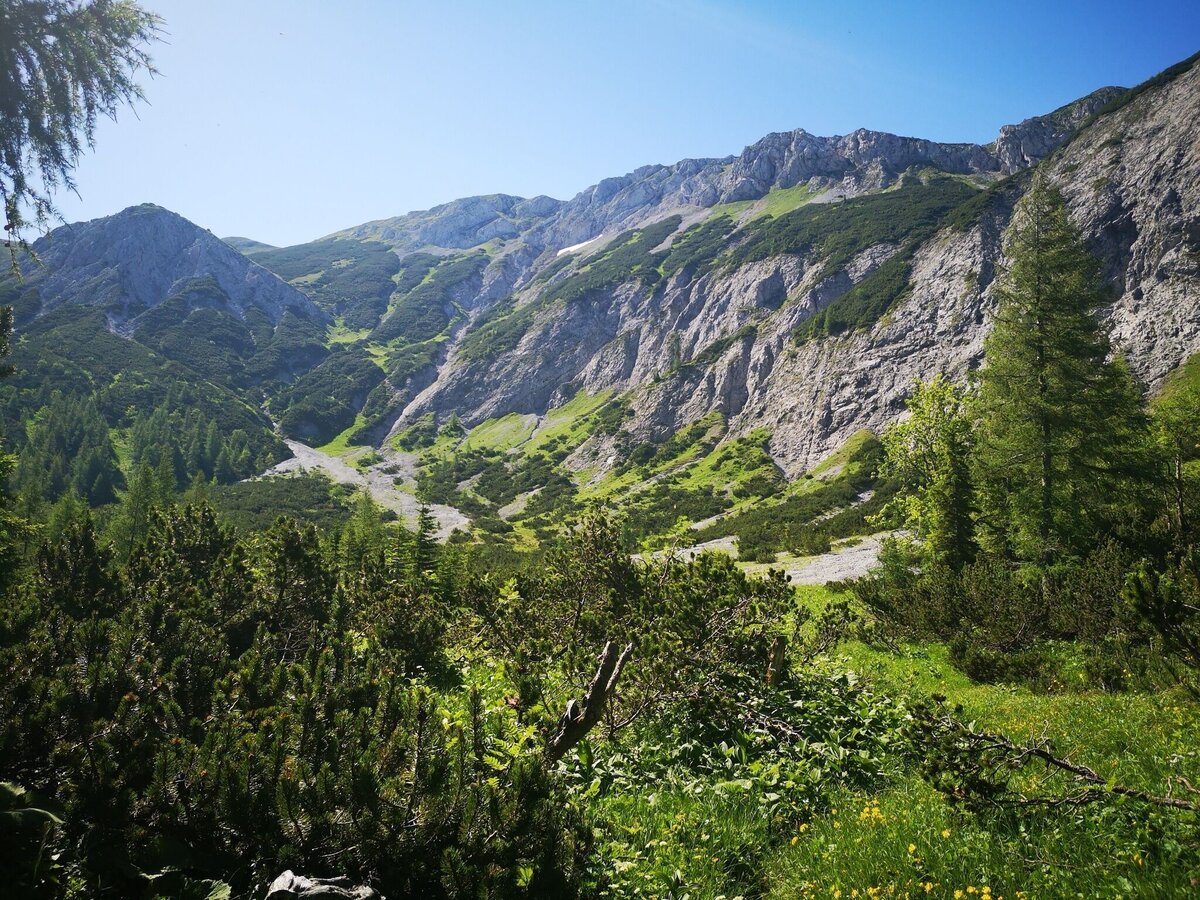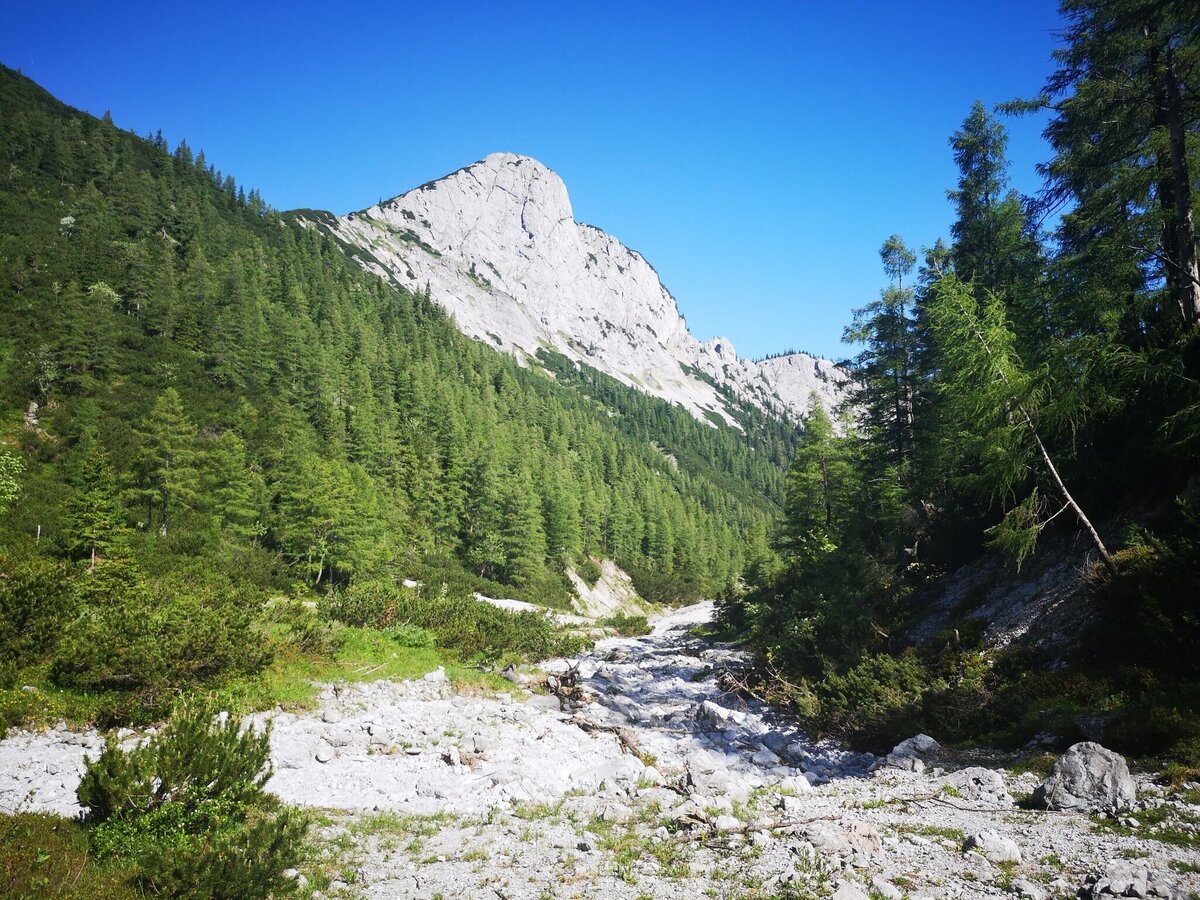 Shortly after, a narrow and slightly overgrown trail branches off to the right from the forest road (marked and signposted). The path ascends steeply alongside a stream until reaching Kleinboden. With stunning close-up views of the Donnerwand, the trail follows the valley floor, occasionally passing through the streambed, and continues upward to Melkboden—an alluvial cone and pristine valley floor with a wild and untouched character.