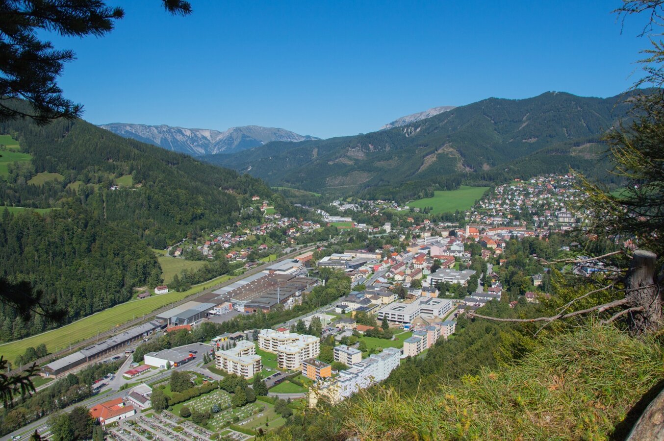 We follow Pretulstraße for 1.7 km, enjoying a breathtaking view of Mürzzuschlag and the surrounding landscape. Keeping right, we pass Bauernhof Lammer and Bauernhof Halbbauer.