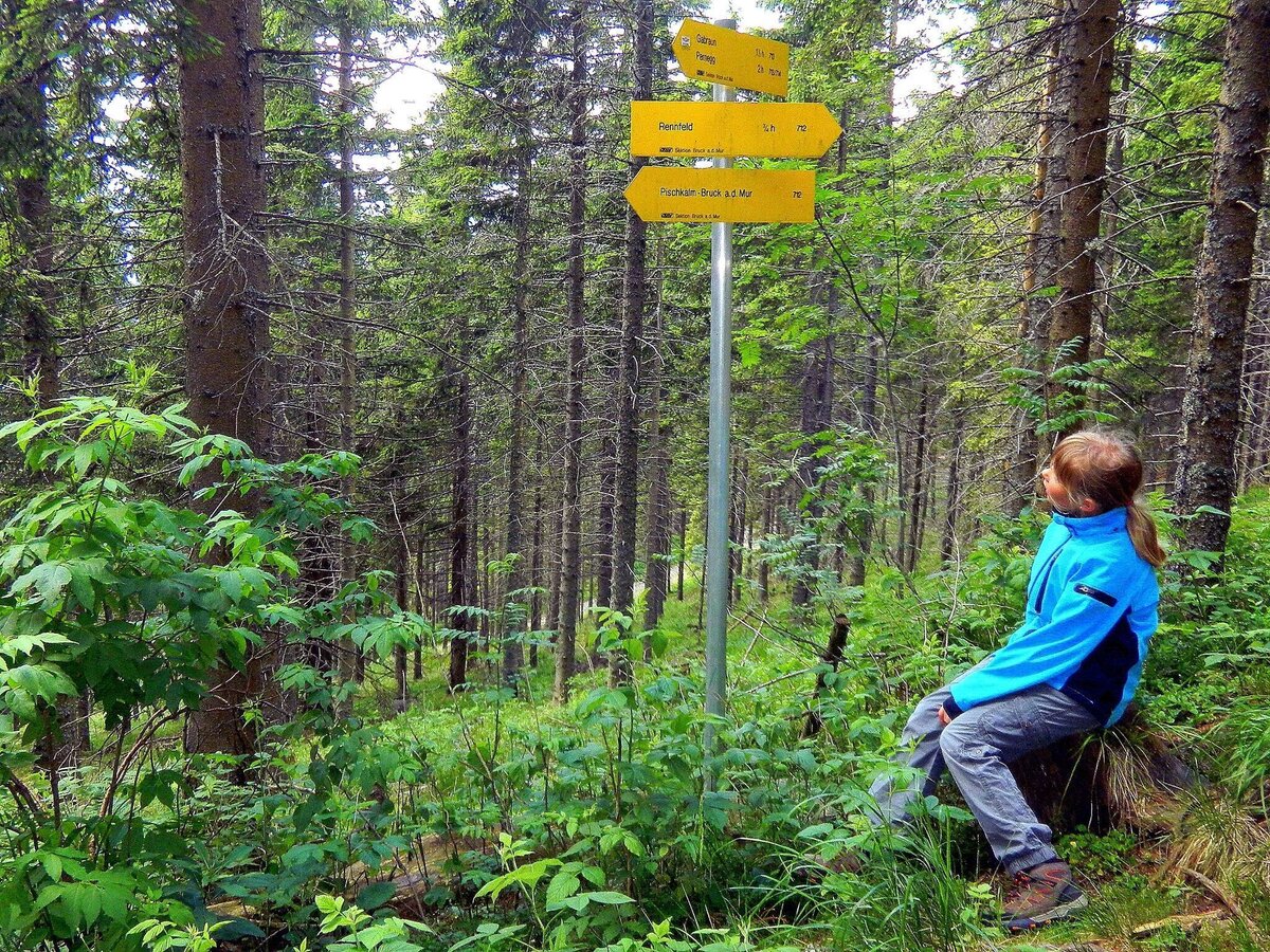 From Pischkalm, first follow a short forest road, then cross it multiple times, continuing on woodland paths until reaching the junction for the Jahnweg (marked). From here, you can either take the forest road to the left, which is easier and longer, reaching the summit in about 1 hour, or take the more direct, steep route via the Jahn summit, reaching the Rennfeld summit in about 45 minutes.