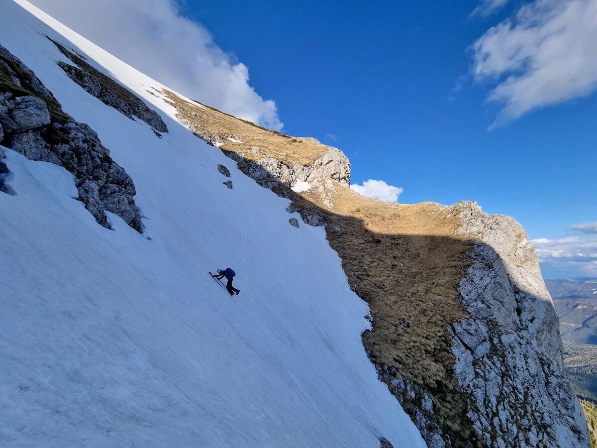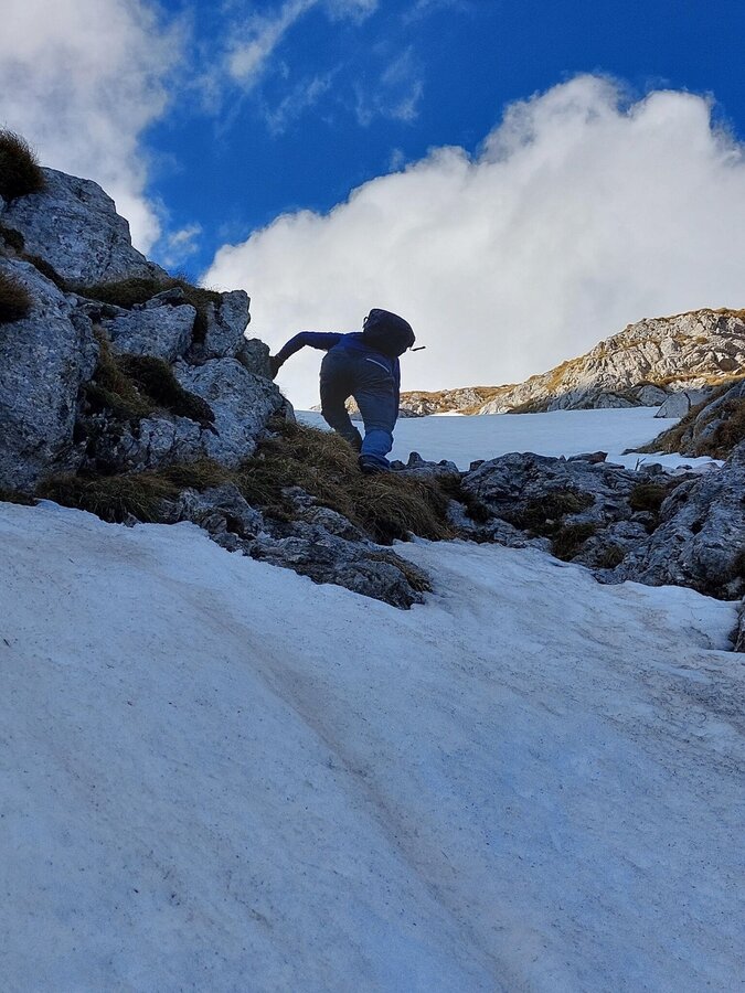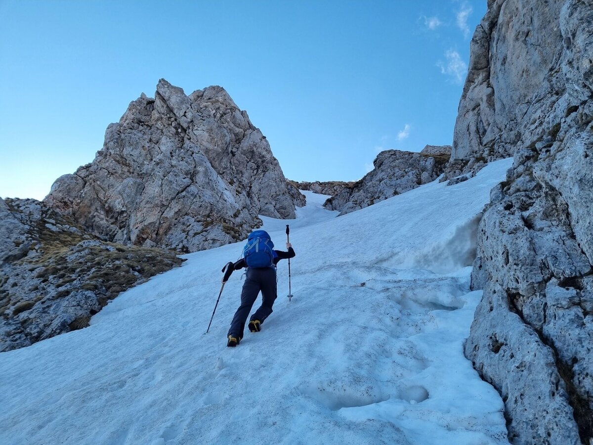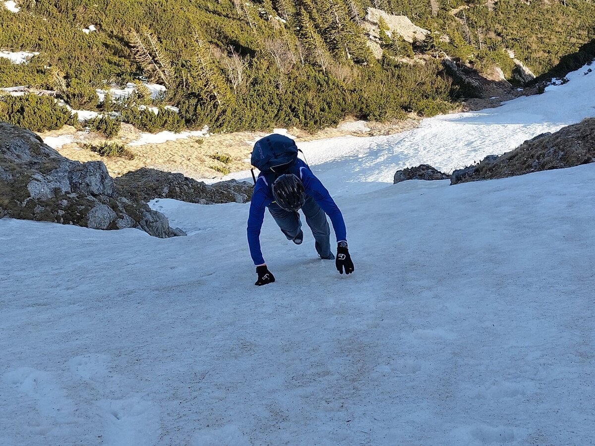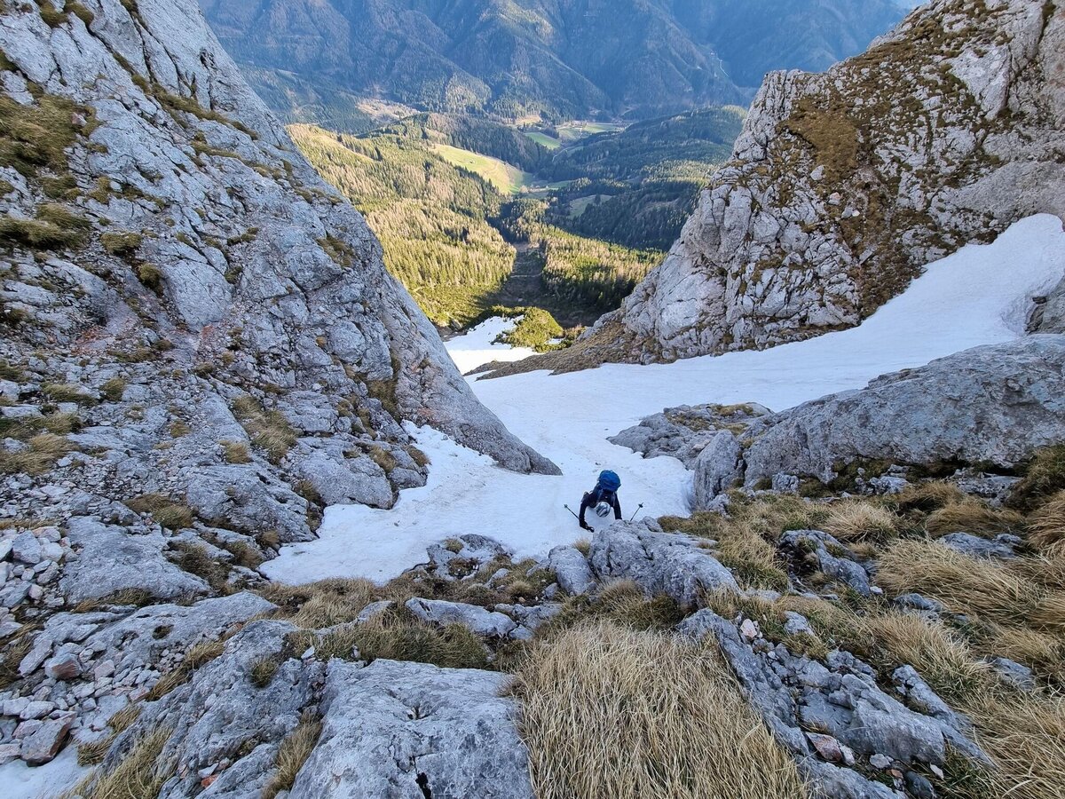 From the start of the secured upper Reißtalersteig, follow the base of the cliffs left until you reach the beginning of the distinctive Sepplgraben (5 minutes from the Reißtalersteig start). This gully is often snow-filled until May, so crampons and an ice axe are recommended.
