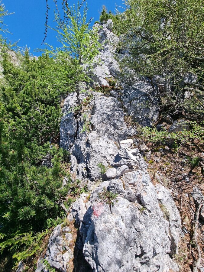From Gasthof Moassa (access only possible from Thursday to Sunday), the hike starts along the marked trail to Karreralm, then continues briefly toward Fuchsloch (keep right). At the first debris field on the right, ascend (a bit tedious) until a small trail branches off to the right into the forest. Continue on the next debris field (briefly) until you reach the marked entry point (through larch bushes).