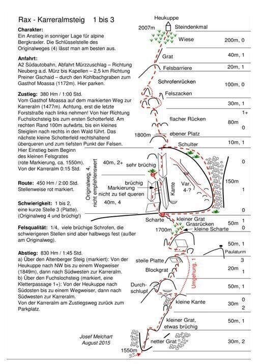 Gasthof Moassa (access possible Thursday to Sunday, otherwise start at the small **parking area in Kerngraben / Altenberg an der Rax) – Karreralm – heading towards Fuchsloch until the first debris field – keep right to the entry point – via the Karreralmgrat (difficulty 2 - 3, key sections with solid rock, the rest somewhat loose, but with fantastic scenery) directly to the 2,007m high Heukuppe – Altenbergersteig or Karl Ludwig Haus / Gretchensteig (secured, A, B) – back to Gasthof Moassa.