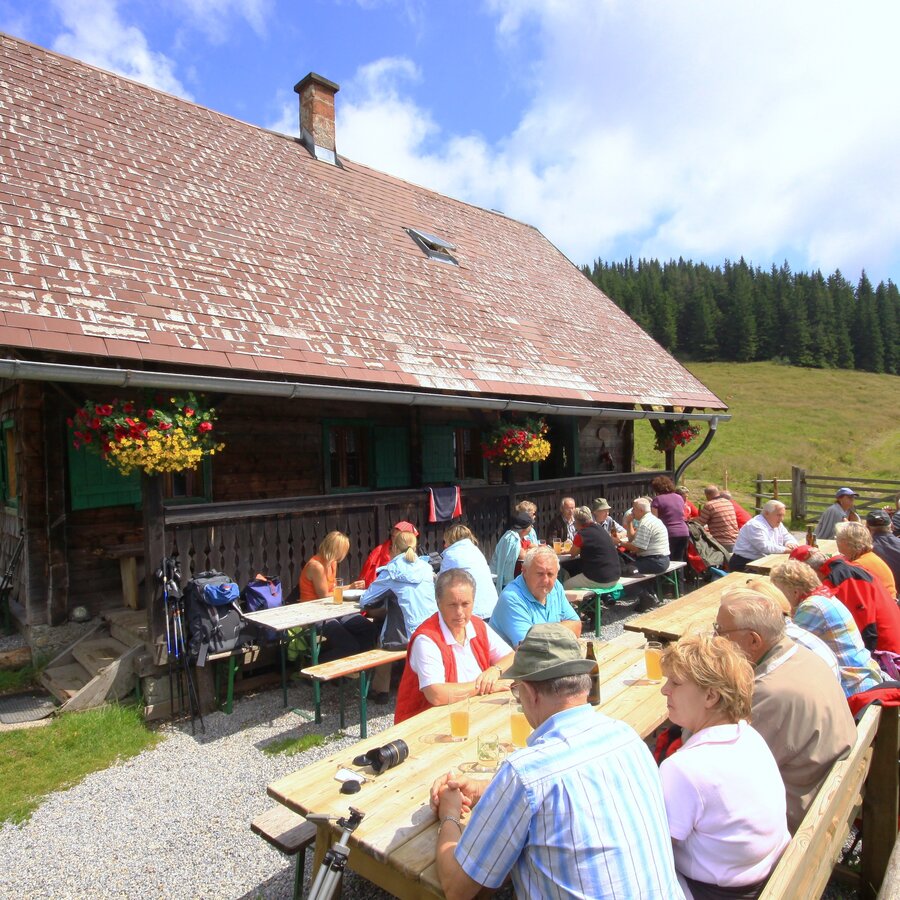 Auf der Stanglalm mit der am Wochenende bewirtschafteten Leopold-Wittmaier-Hütte wird das Panorama gegen Westen alpiner und unser Weg führt bergab nach Mitterdorf im Mürztal. Die Hundskopfhütte ist danach unser nächstes Ziel und weiter dann der Pretalsattel, der die Veitsch mit dem Aflenzer Becken verbindet. Unser Ziel ist an diesem Tag schließlich die Rothsohlalm am Fuße des Blumenberges Veitsch.