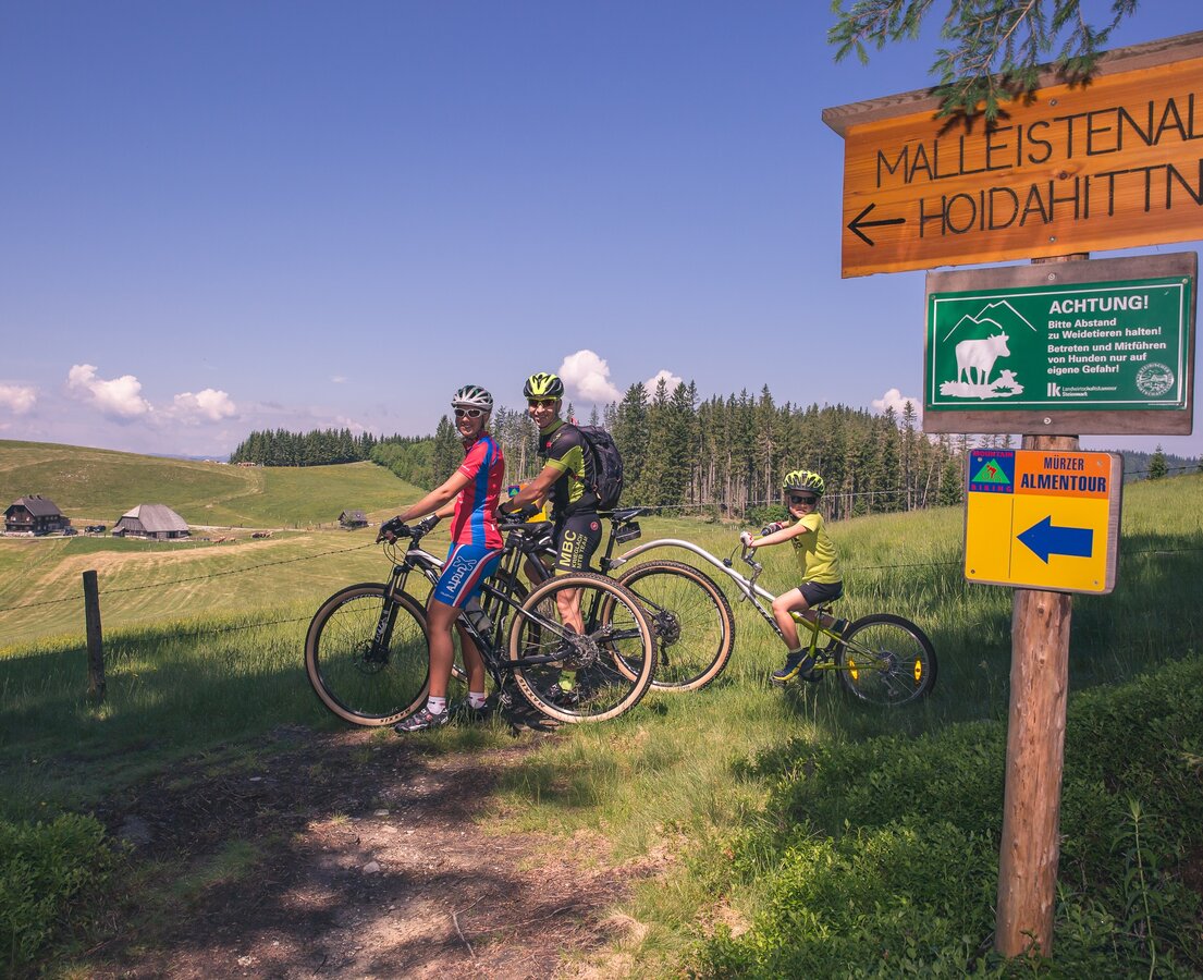 We start our mountain bike tour in the centre of Krieglach and ride over the Mürzbrücke (bridge) to the junction with the Mürztalradweg R5 (right, towards Alter Sommer). Now we follow the cycle path, which leads us past the junction to Massing. At the next junction, we turn left into the Malleisten area. Now follow the ascent - steadily climbing - to the Malleisten. The first 4.5 kilometres are on an asphalt road, which then turns into a well-maintained gravel road that leads directly to the Malleisten Alm. The climbs along the route are interspersed with short flat stretches where we can recharge our batteries. After a rest at the Malleistenalm hut, we continue our route to the Hönigsberger Alm, passing the Lammeralm and the Wetterkreuz there. Now we take the road that leads up the Hönigsberg downhill to Langenwang. The main road (Wiener Straße) takes us into the centre, via Grazer Straße and Hohenwangstraße we reach the Mürztal cycle path R5, which takes us back to Krieglach via the Au.