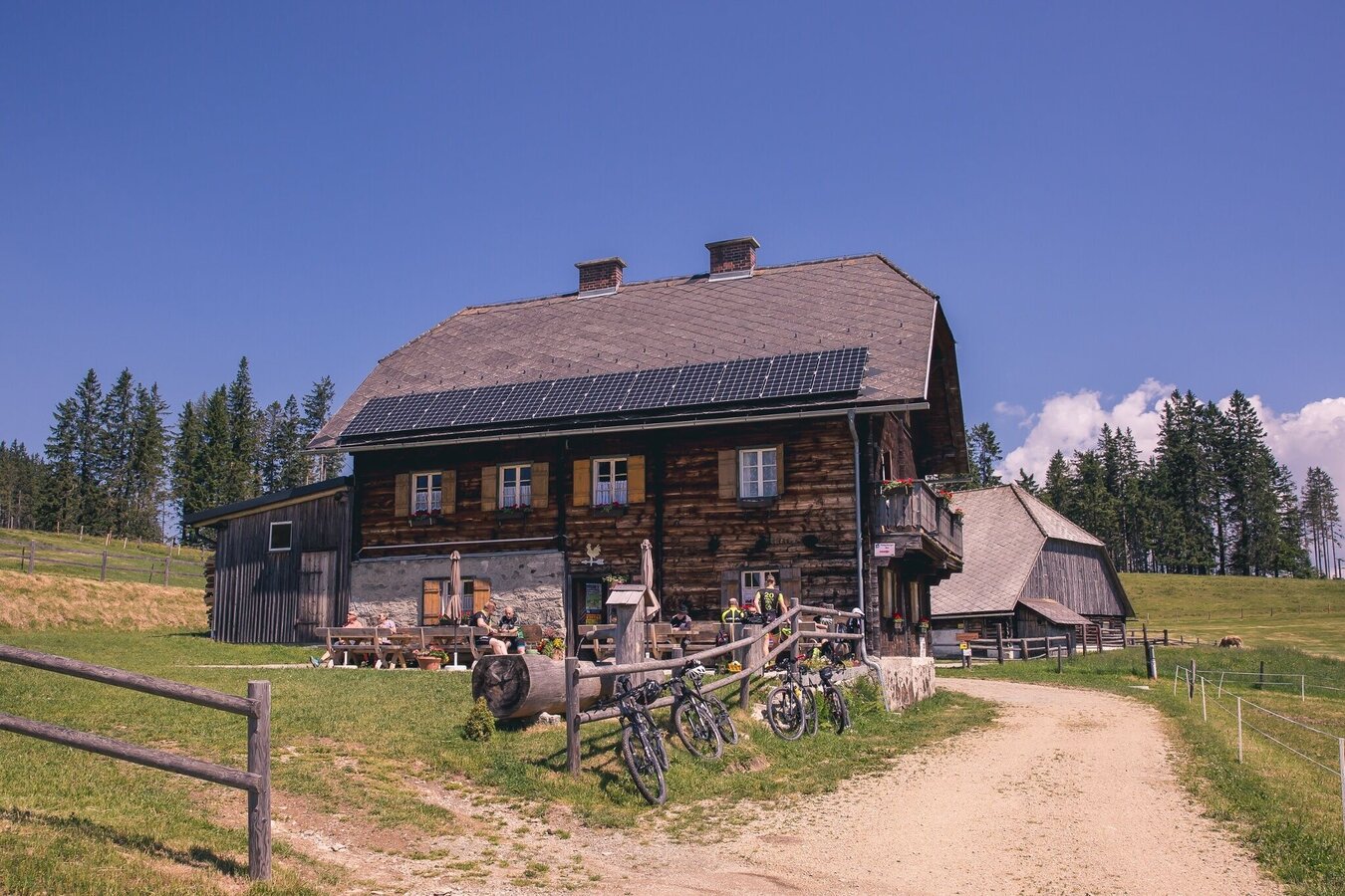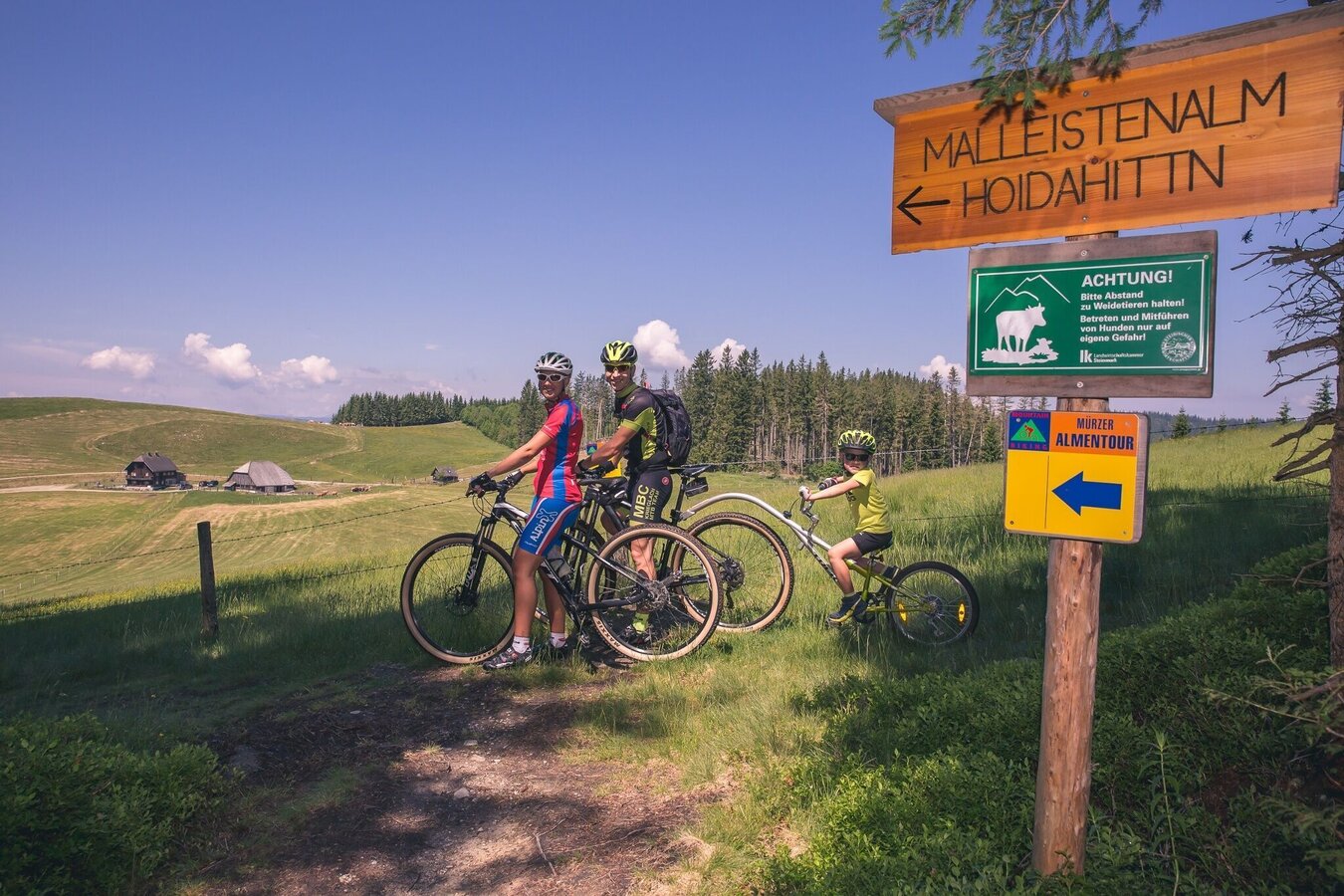 We start our mountain bike tour in the centre of Langenwang and ride along the main road (Wiener Straße) towards Hönigsberg. At the ‘Raingasse’ junction, we turn left and follow the R5 Mürztal cycle path. We follow the road up the Hönigsberg, pass a barrier and keep left at the Hönigsbergalm junction. If you like, you can cycle to the Hönigsbergalm and fortify yourself for the rest of the route. However, we continue past the Wetterkreuz to the Lammeralm. This panoramic section offers us marvellous views of the Mürztal valley and the Fischbach Alps. From the Lammeralm, we cycle another short stretch and finally reach the Malleisten Alm. Here we take a well-earned break at the Almhalter and fortify ourselves for the rest of the route. On the descent, we can choose from 2 options: via the Malleisten Alm and the Feistitzberg back to Langenwang, or via the Malleisten to Krieglach and from here via the R5 Mürztal cycle path back to Langenwang.