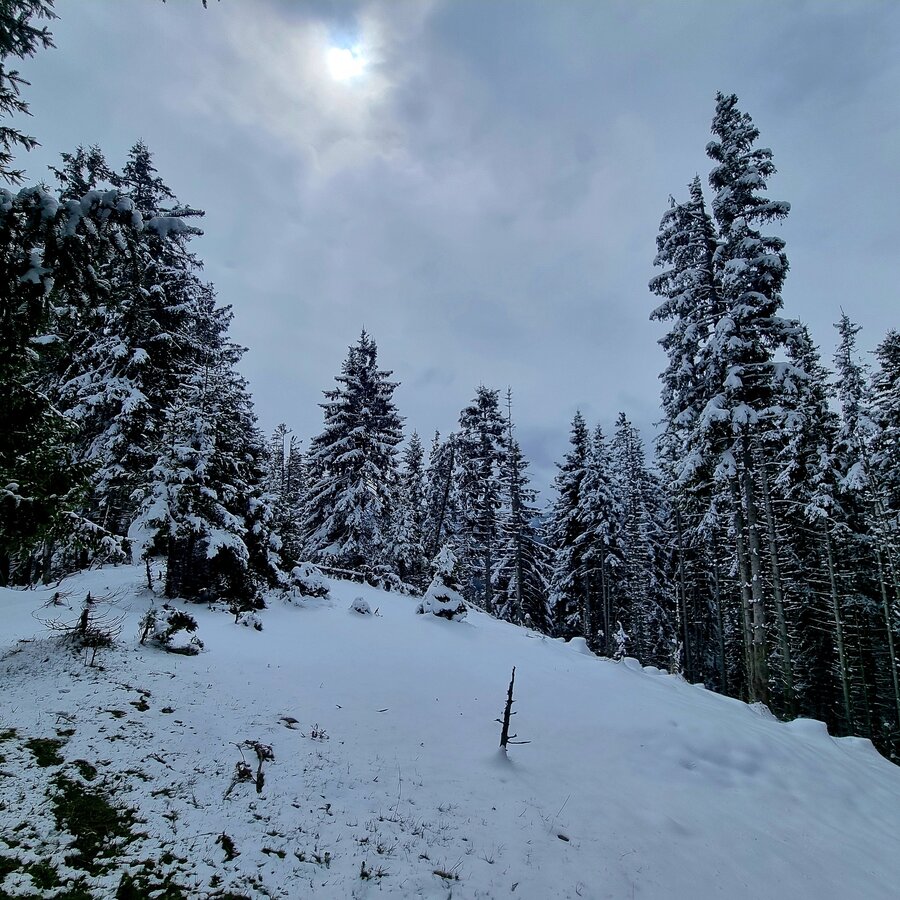 Here, follow the (new) forest road gently uphill, keeping to the right, then slightly downhill in an easterly direction (offering beautiful views of the Rax, Semmering, and Pinkenkogel) until you reach a gully descending from the Peterbauernkogel. From here, you can climb steeply through the forest to the inconspicuous, wooded summit (two small summit stones/marks).