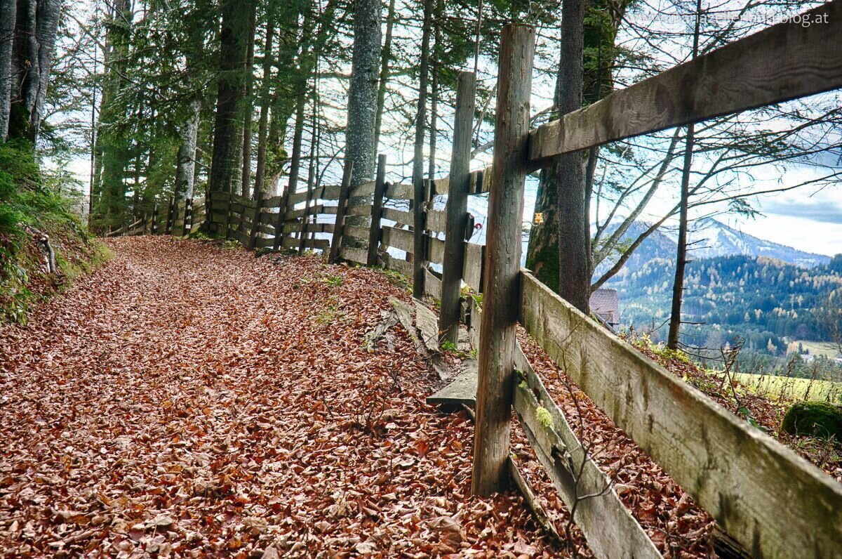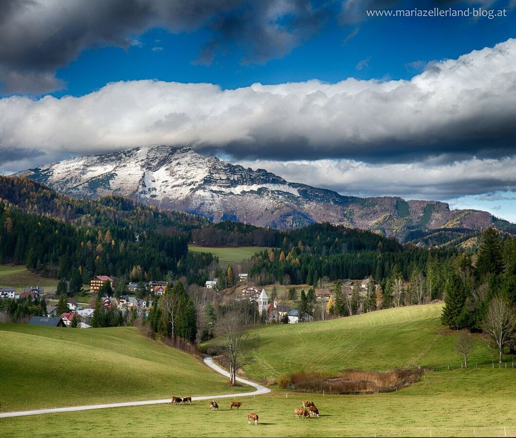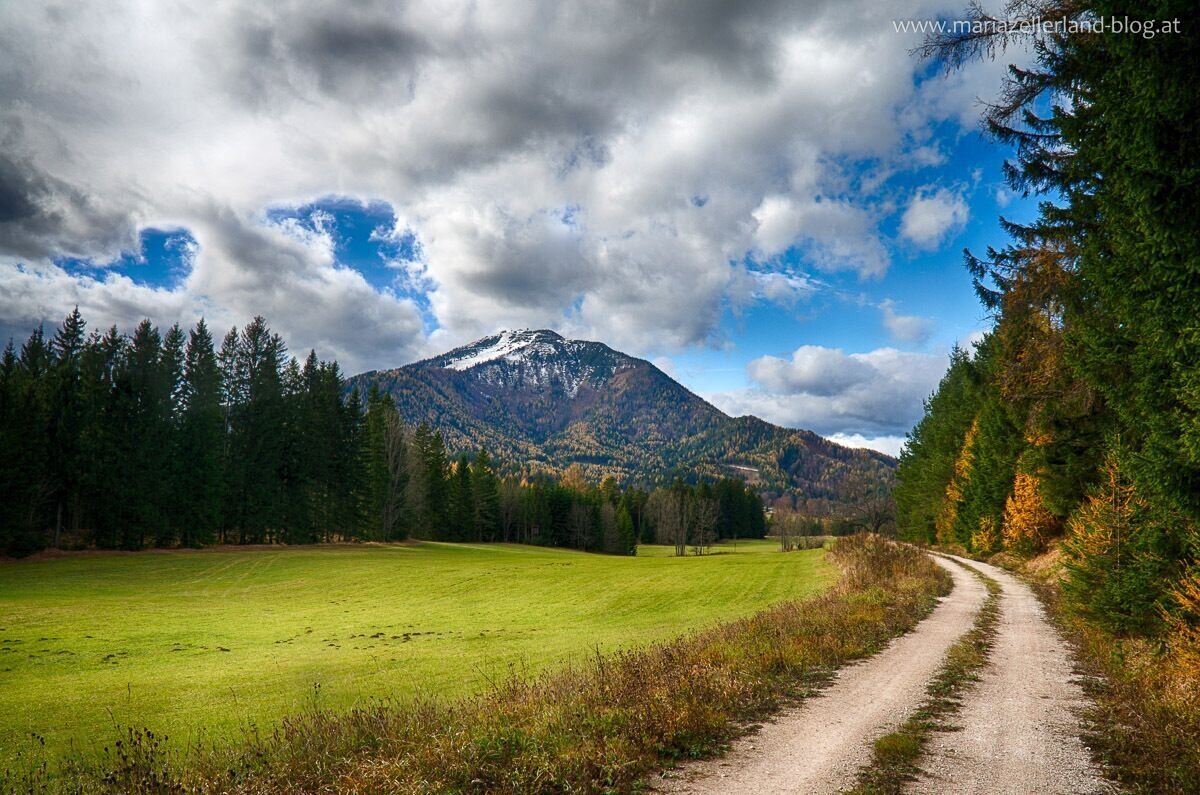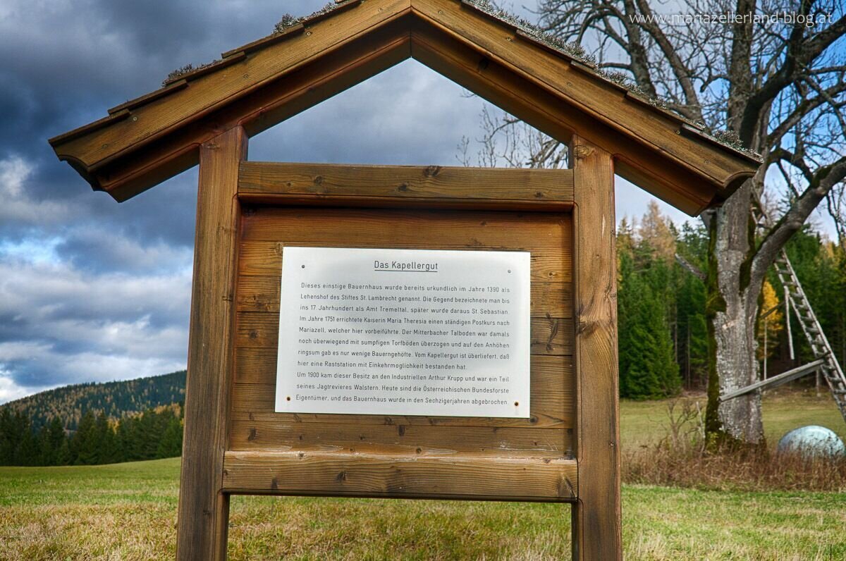 From there, after the former Filzwieser inn, we go up to the left and along the Göschlhofweg until we reach the Göschlhof farm. On the way to the Göschlhof we have a wonderful view of the Ötscher. At the Göschlhof we now go left behind the farm past, through a forest path to the Kapellerwiese (here is also a board with information about the Kapellergut). Also from here there is a beautiful view of the mountains of the Mariazell region.