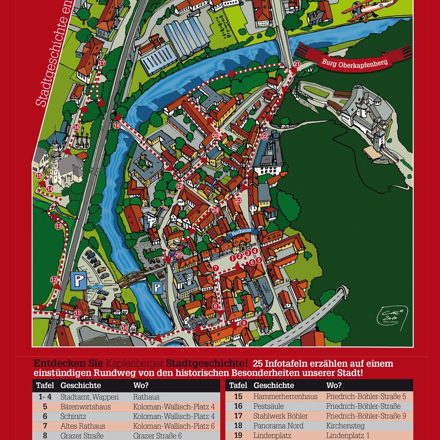 Stadtplan und Altstadtrundgangflyer - kostenlos im Tourismusbüro, Wiener Straße 58/4, 8605 Kapfenberg erhältlich (Telefon: +43 3862 55020-30) erhältlich.