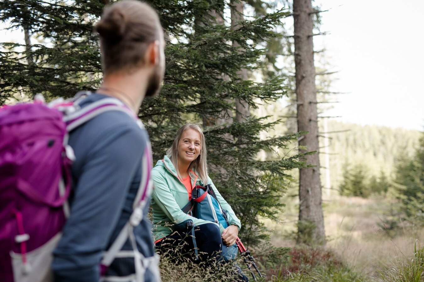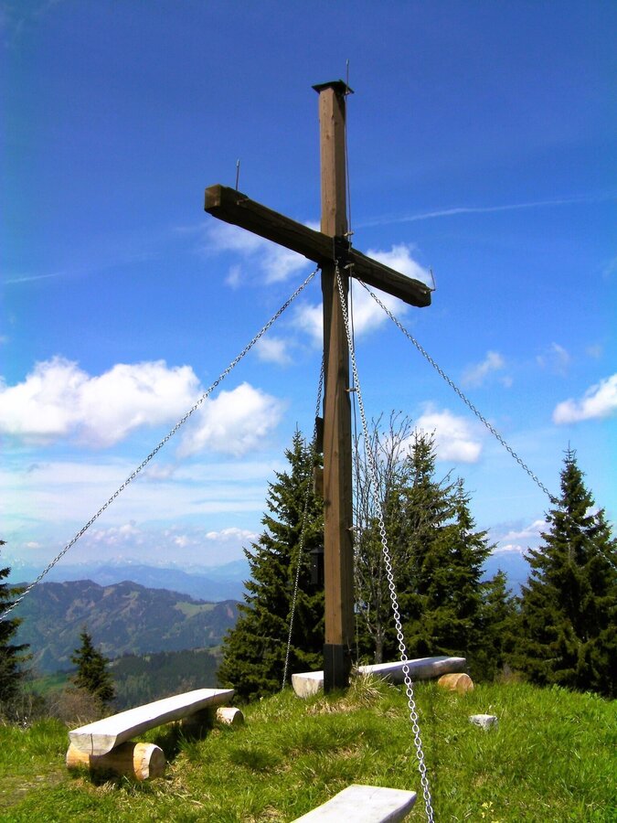 After crossing another stile, turn sharply right and follow the fence line steeply uphill, where you’ll soon spot further waymarks. These lead leftward into the forest, where the trail becomes clearly visible again. A slanting climb over a meadow is followed by a forest track that returns to the ridge. From there, the marked path leads steeply uphill to the summit of Hochschlag.
