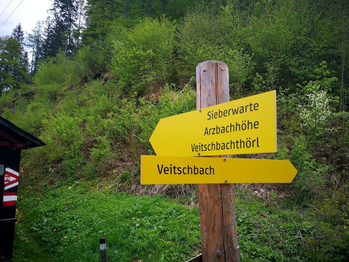 Now the trail continues uphill (sometimes a little steeper) through the extensive forests of the Hocheck via the Arzbachhöhe (rest bench) to the Veitschbachtörl (prominent hiking trail junction, several signposts, panorama square).