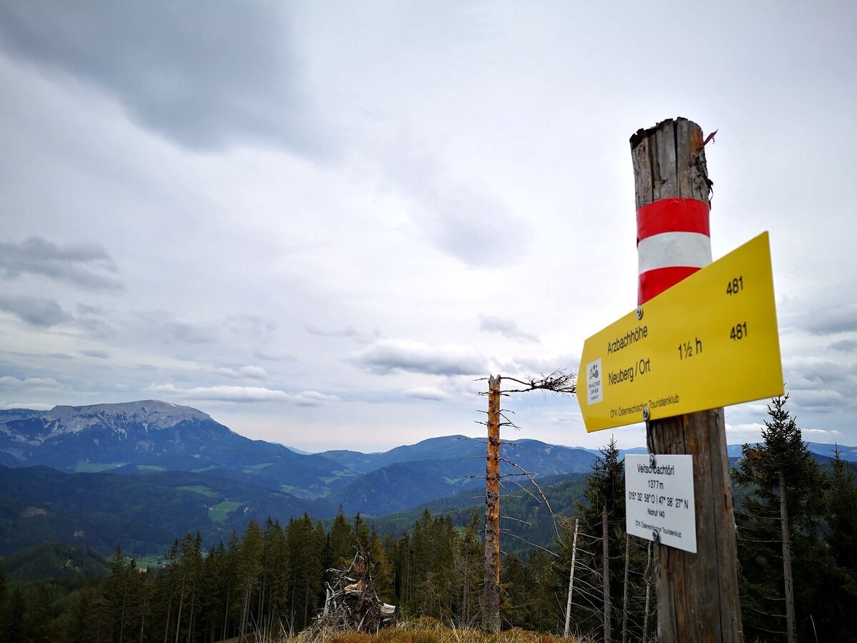 From Neuberg Minster, we walk southwards in a few minutes to the entrance of the Veitschbach valley (directly by the Mürztal cycle path, Bahnhofstraße). There we follow the yellow arrow markings behind the small curling rink and a path with several hairpin bends uphill to the newly renovated Sieberwarte (wonderful view of Neuberg and the cathedral).