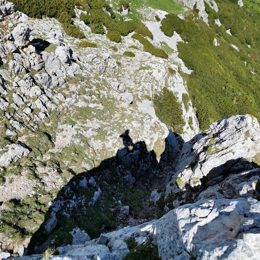 Hier wäre übrigens linkshaltend ein Ausqueren zum markierten und versicherten Steig möglich.