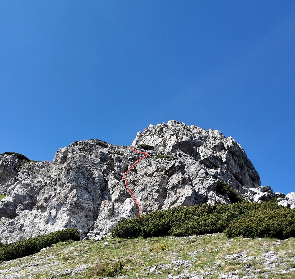 Dort wo das erste Mal der Wandfuß erreicht wird (großer grüner Pfeil) einige Meter nach rechts und dem mittleren der drei Kamine (Vineta Jaroschekkamin) folgend aufwärts kletternd (SG 2, großteils fester Fels) bis zu einer sperrenden Felsstelle. Nach rechts queren und dann gleich gerade aufwärts zum breiten Absatz unter der zweiten großen Felswand des Gretchensteiges (Klettergarten).
