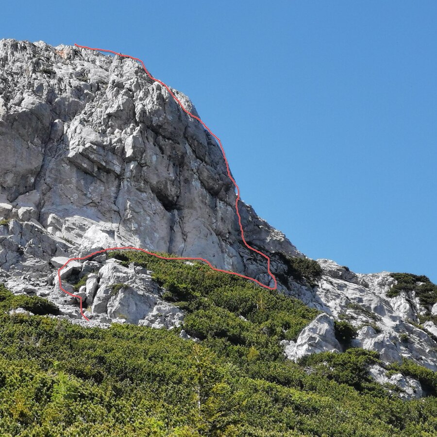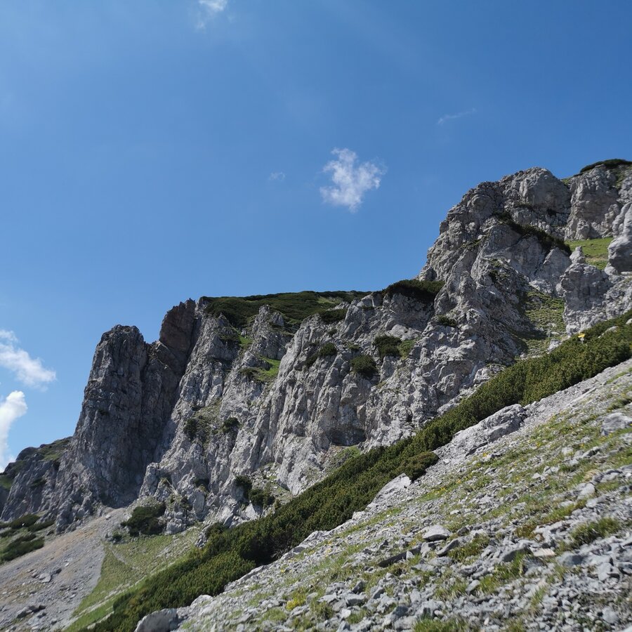 Wir steigen aber gerade aufwärts, einer Latschengasse folgend, zum rechten Wandteil des Gretchensteig - Klettergartens. Dort wo sich die steile Wand etwas zurücklegt beginnt der Wildkogelsteig. Über gestufte Wandstellen (SG 2, fester, jedoch etwas rasendurchsetzter Fels) gerade aufwärts und in einer rechts - links Querung (Bohrhaken) zu einer von links herab führenden Schrofenrinne. Am linken Begrenzungsgrat der Rinne (tw. Gehgelände, Stellen SG 1 - 2, Bohrhaken) gerade aufwärts und nach einer letzten kurzen Wandstelle (SG 2, Bohrhaken) zum schon sichtbaren Stahlseil des Ausstiegs des Gretchensteiges.