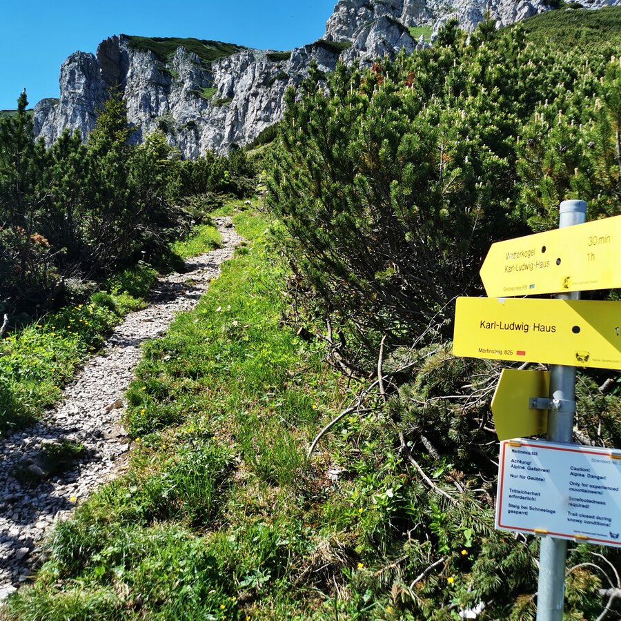 Über den Gretchensteig zu den Felswänden und rechtshaltend vom versicherten Steig (im Sinne des Aufstieges) über die beiden Felsstufen aufwärts. Kurze Kletterstellen bis zum 2. Schwierigkeitsgrad wechseln mit Schrofenpassagen. Bei Nässe meiden!