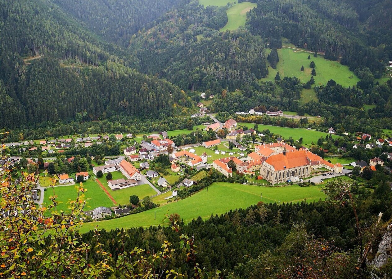 At Neuberg Abbey (car park, Steirischer Bauerngarten), either an unmarked path leads directly across the meadow or along the small road past Gasthof Holzer and the Kalvarienberg to the Schenkfeld promenade (literature trail).